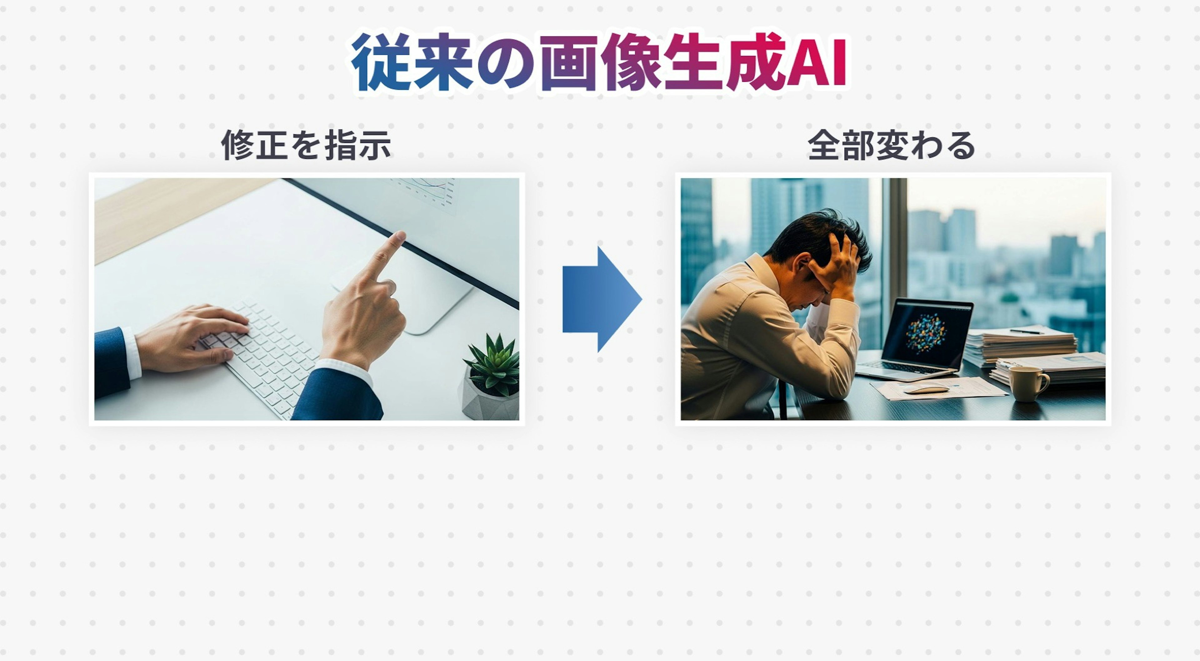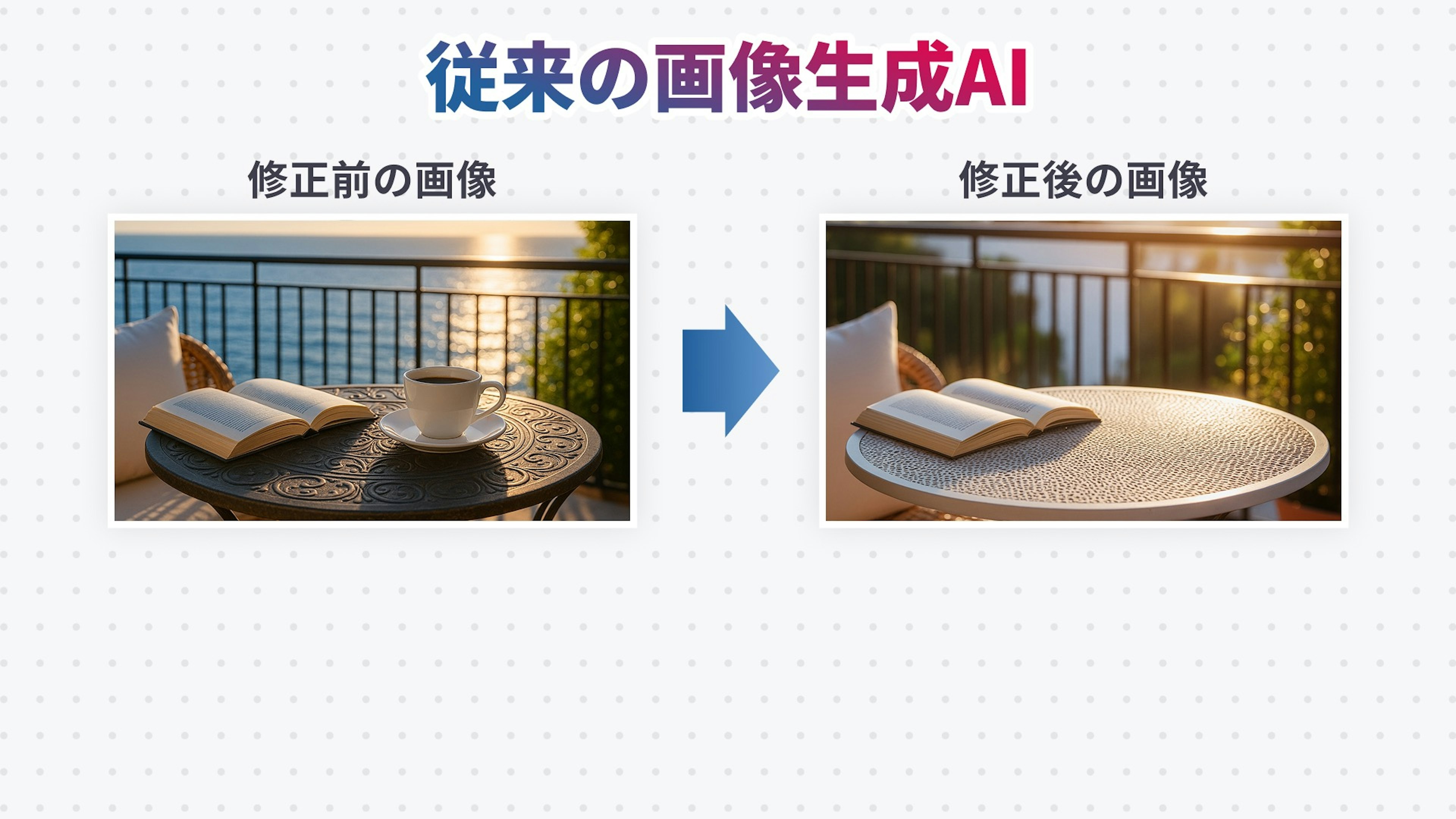 これまでの画像生成AIでは、いまNano Bananaを使って行った『指示した内容だけを変える』ことができませんでした。