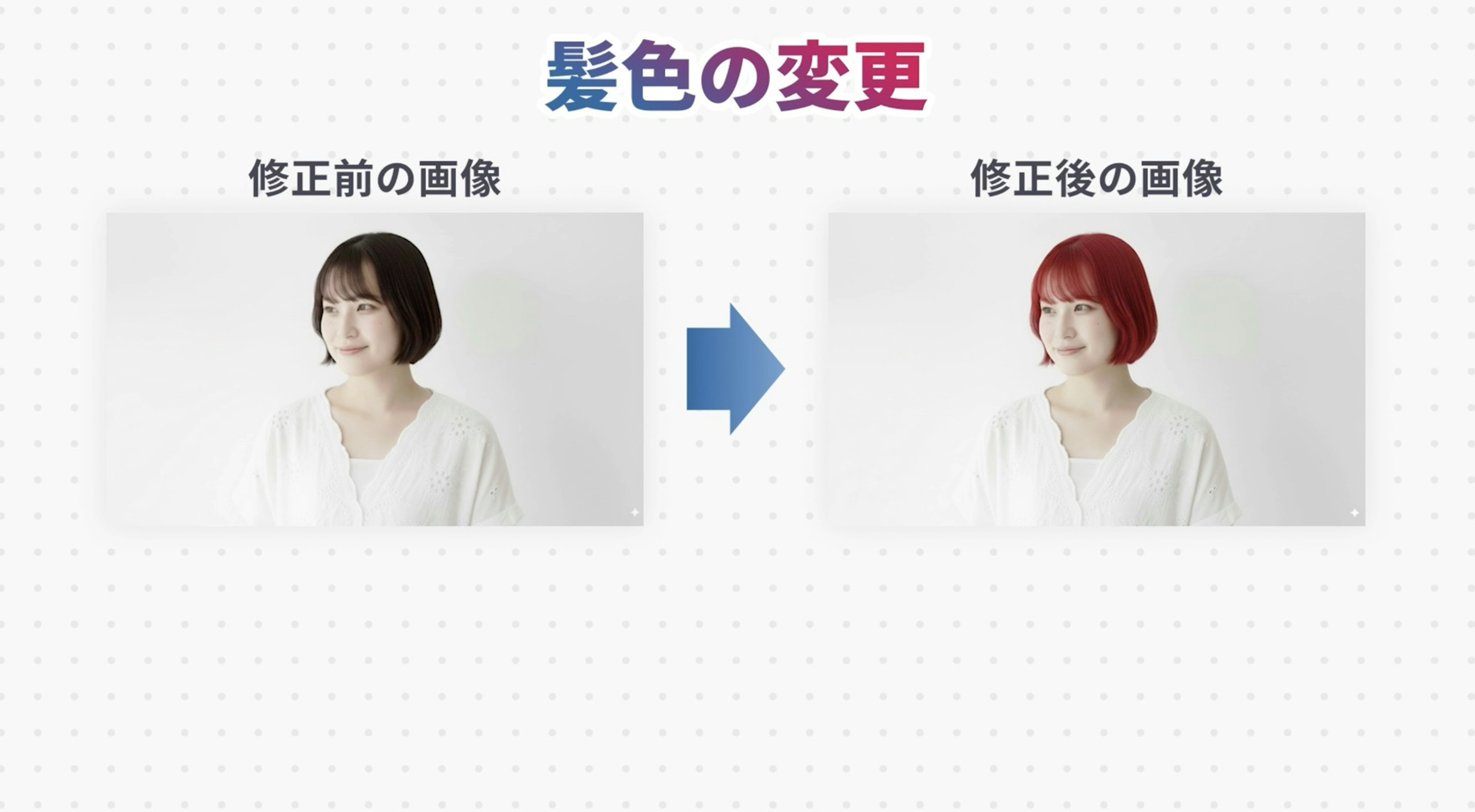 指示をしてからしばらく待つと、黒色だった女性の髪が、このように自然に髪色だけが変わりました。