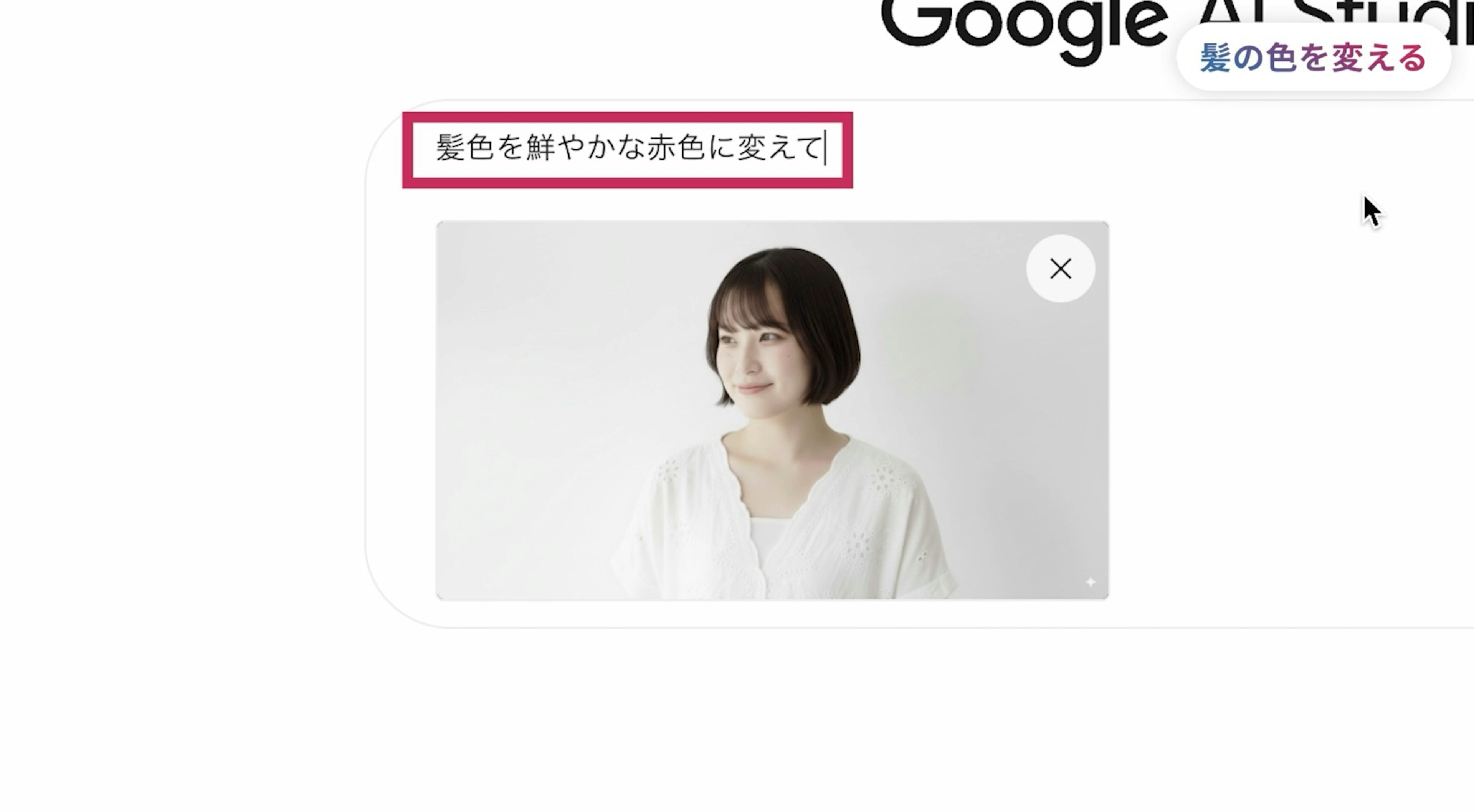 例えば、モデルにしたい画像をこのチャット欄に渡して、こちらの写真の女性の髪の色を『鮮やかな赤色に変えて』と指示してみましょう。