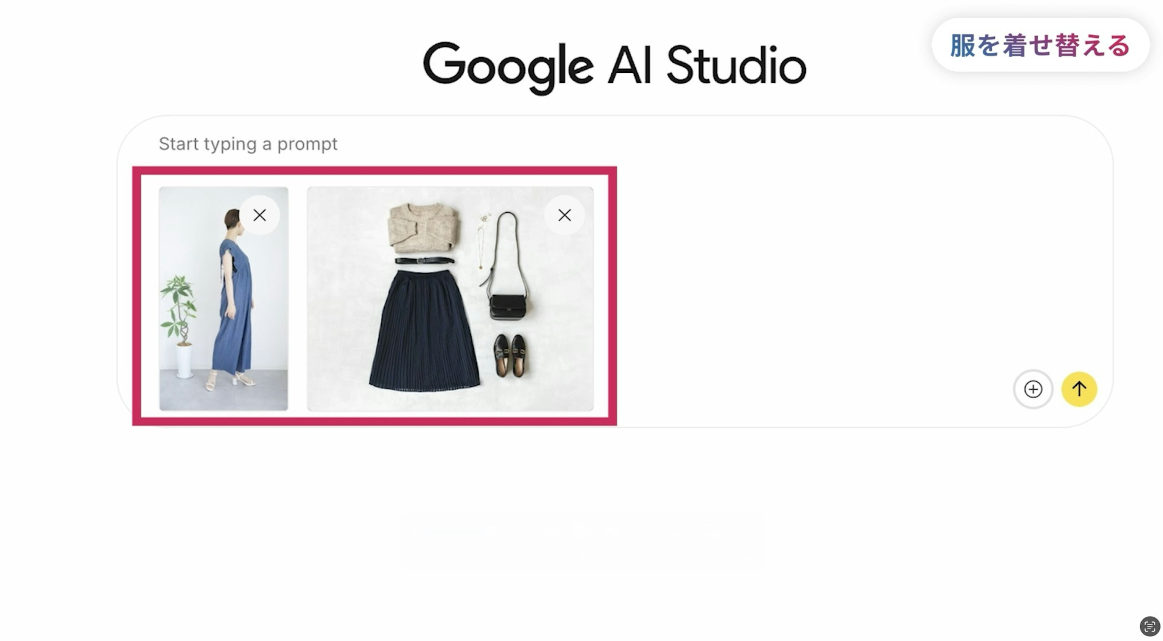 気になる服の画像と自分の写真をNano Bananaに渡して、『画像1枚目の服を画像2枚目の服に変えて』とお願いしてみます。