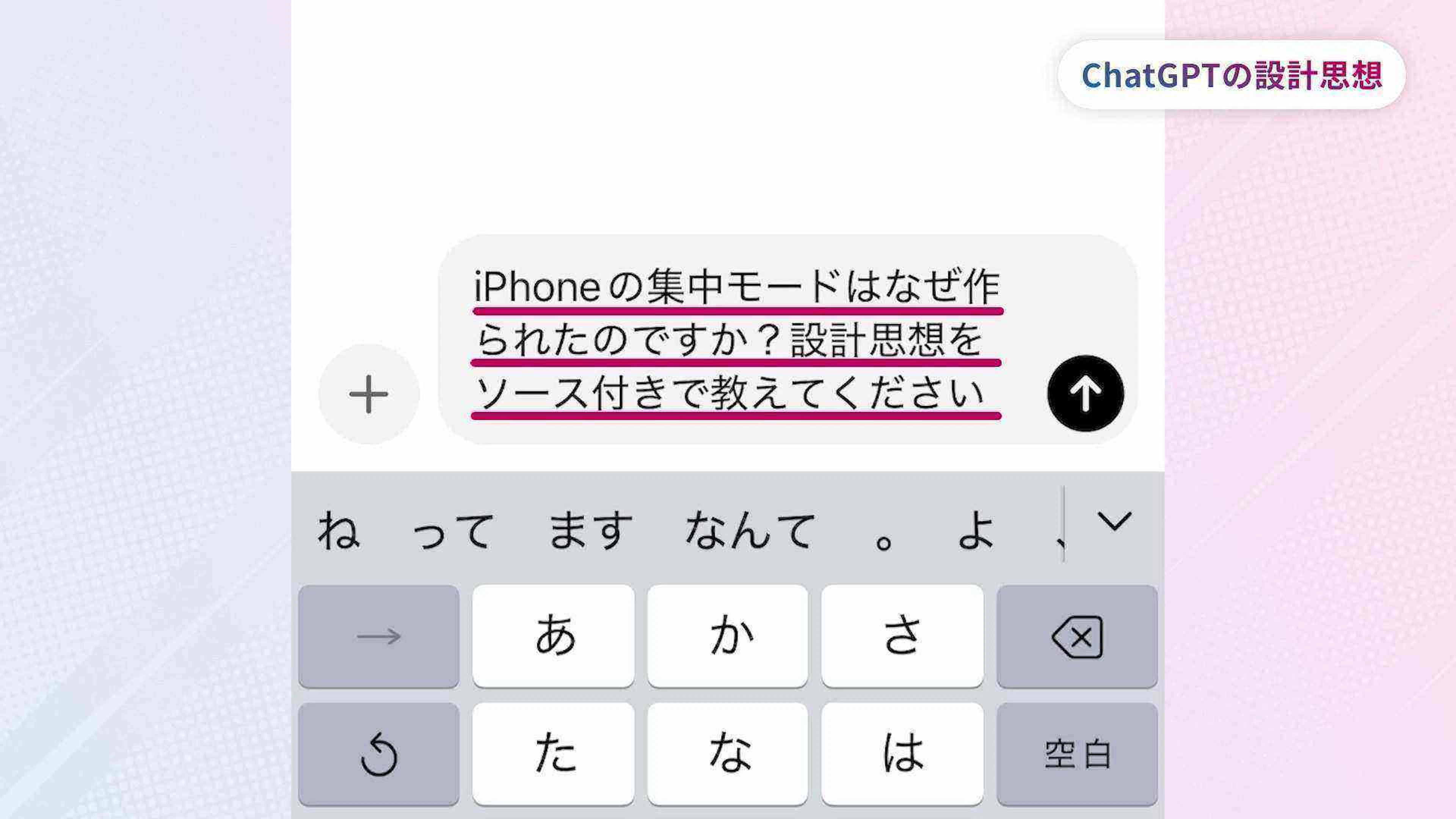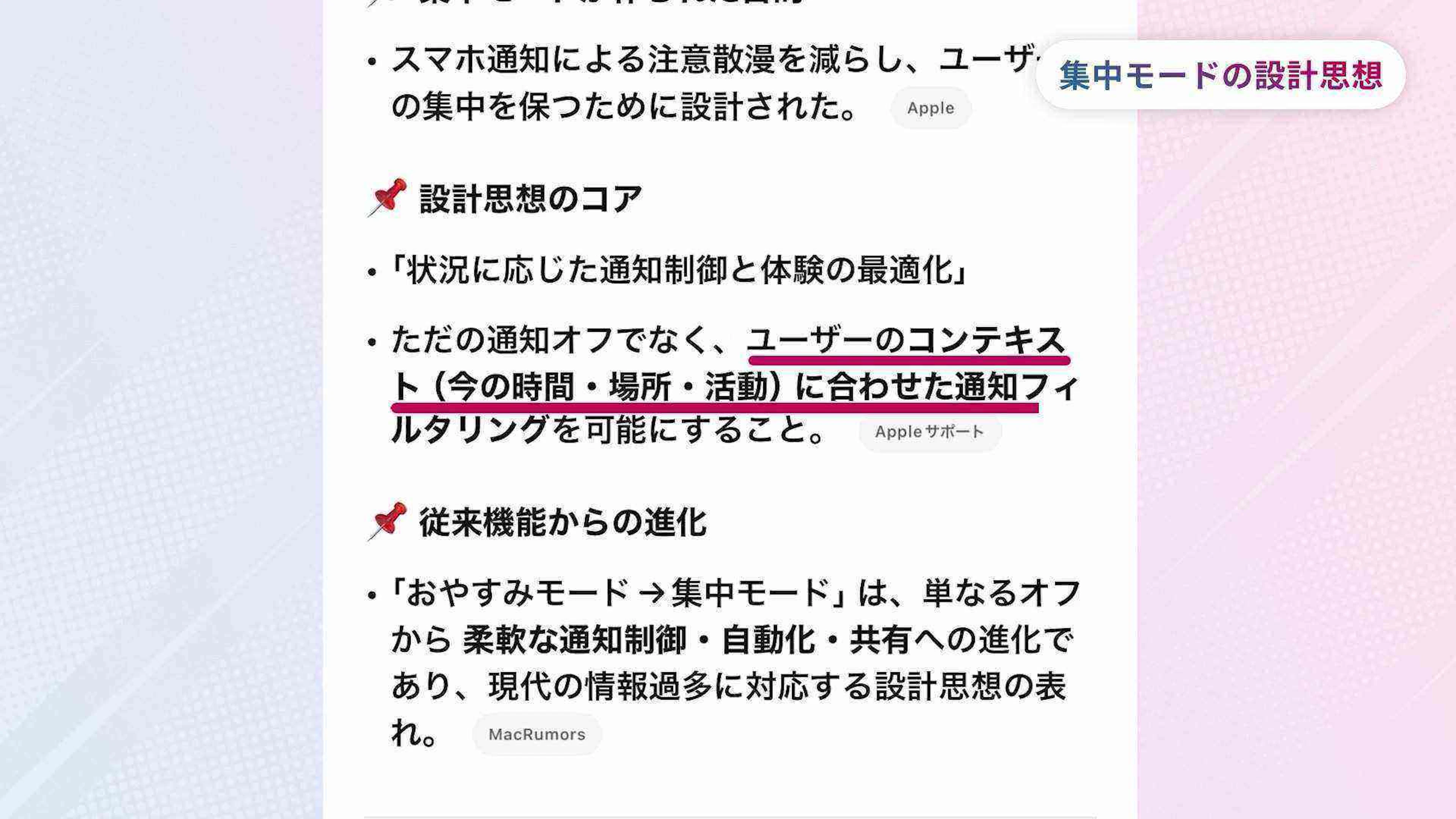「iPhoneの集中モードはなぜ作られたのですか?設計思想をソース付きで教えてください」と入力してみます。