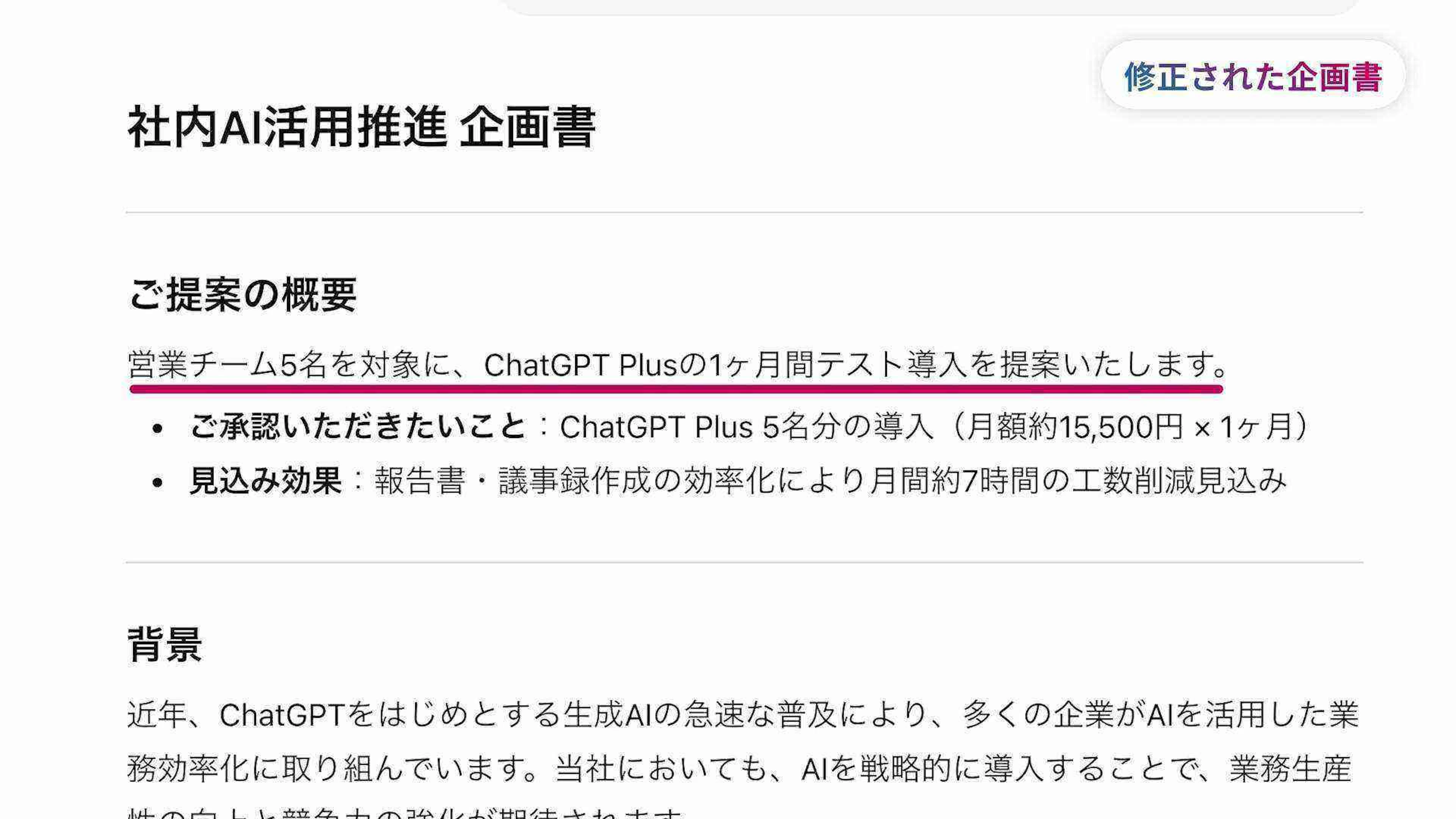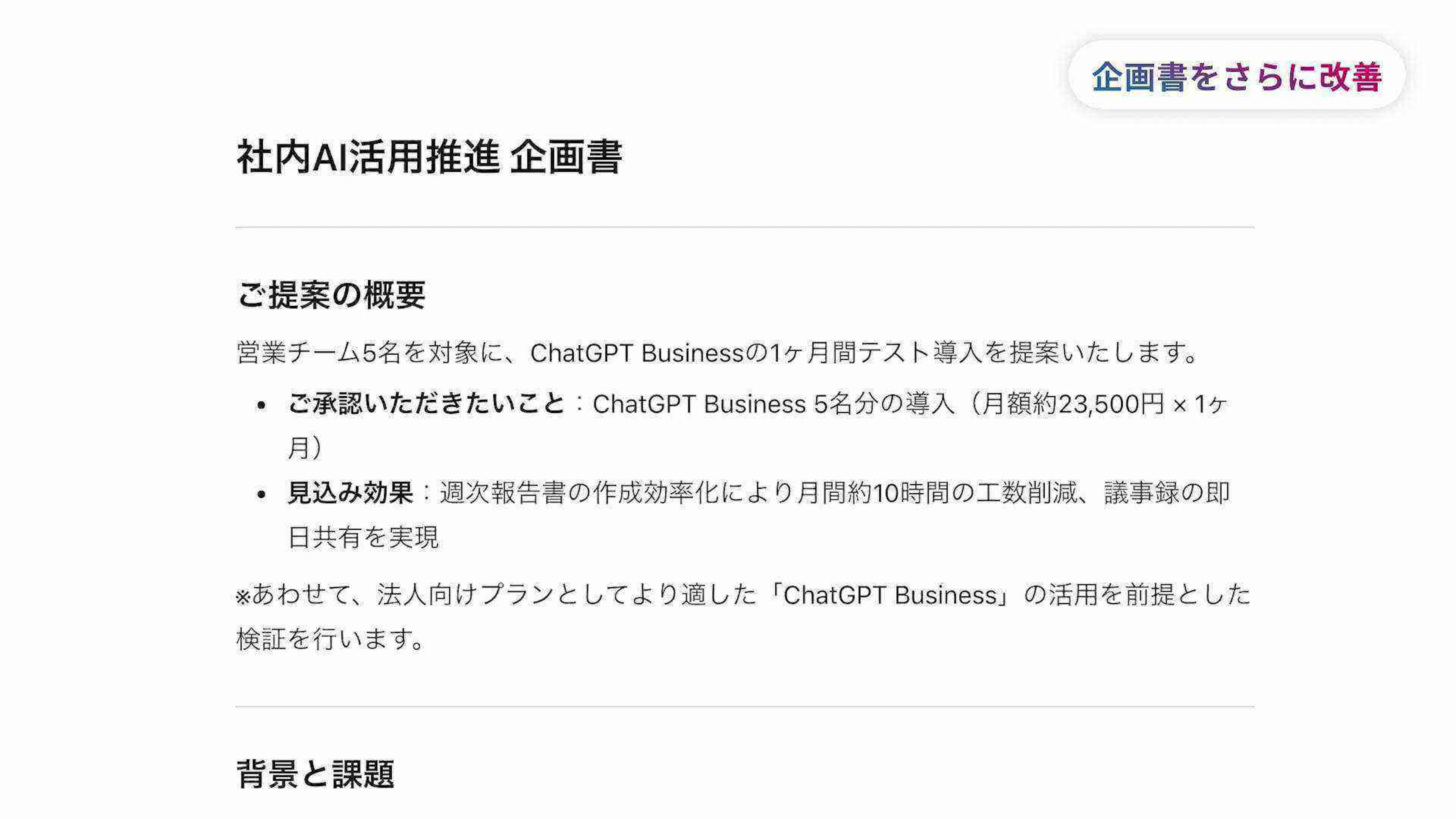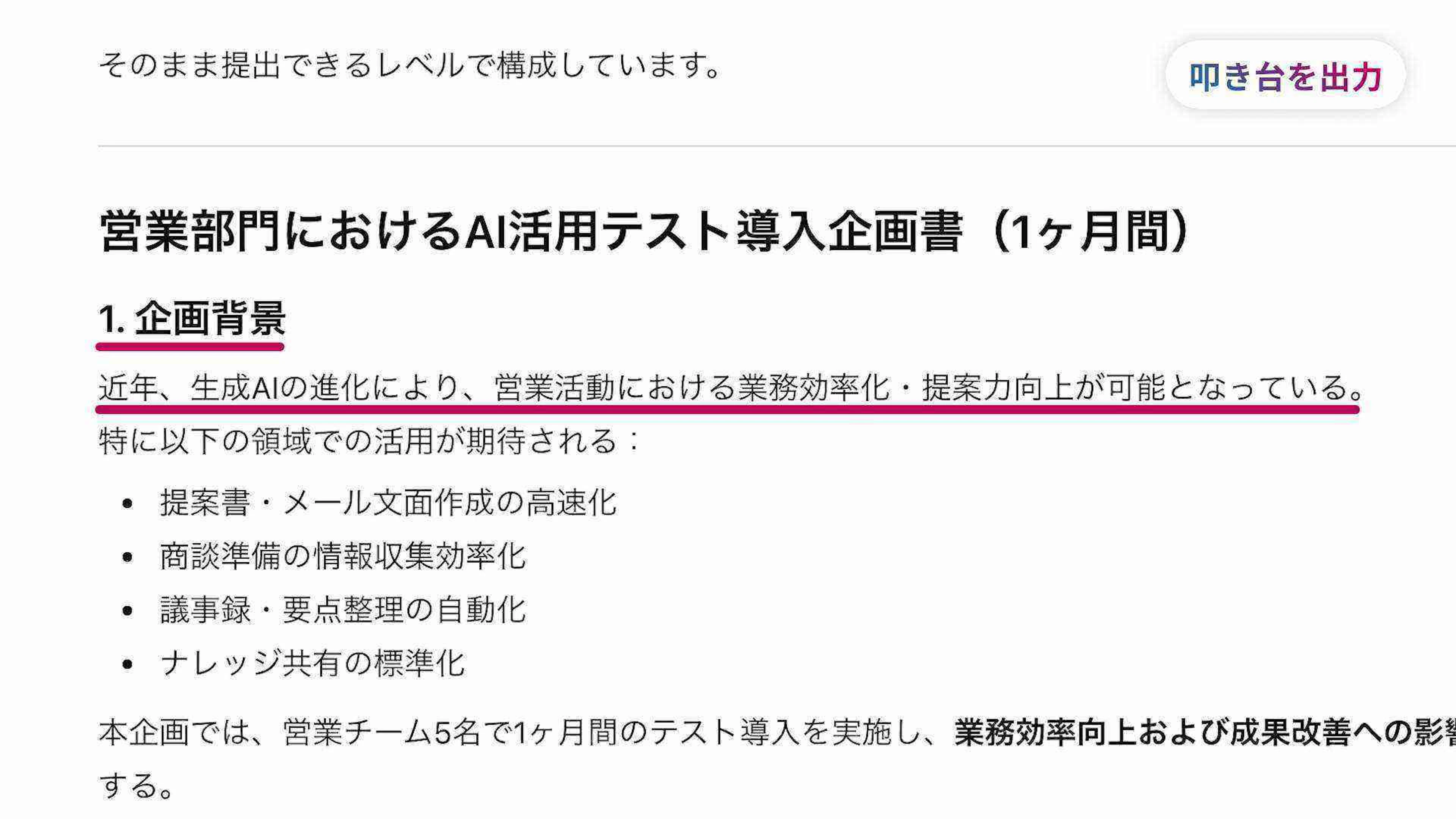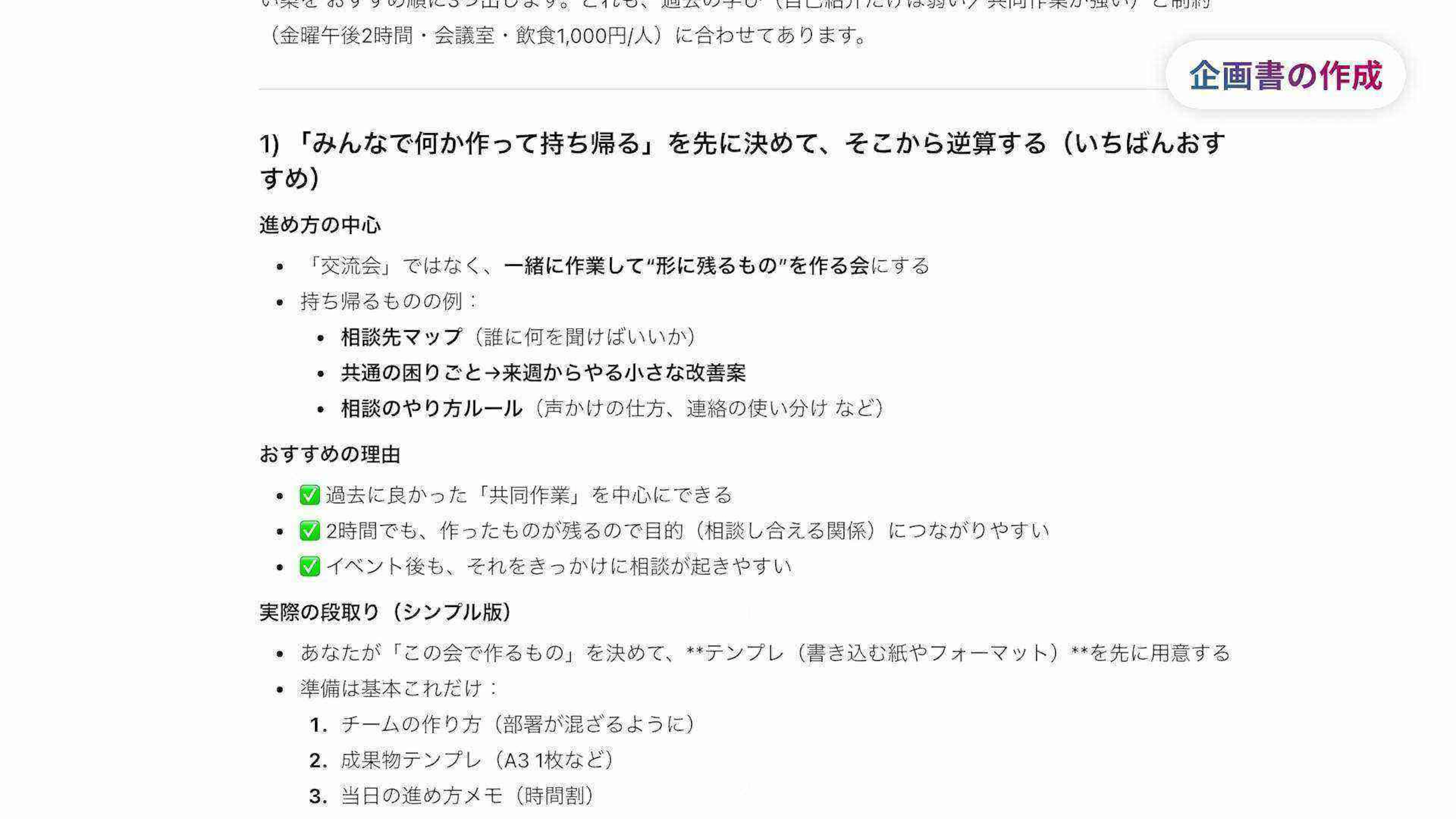 他にも社内イベントの運営を任されたとき、自分で段取りを考える前に、まず仕事の進め方からAIに提案させれば、自分では思いつかなかった進め方が出てくることもあるでしょう。