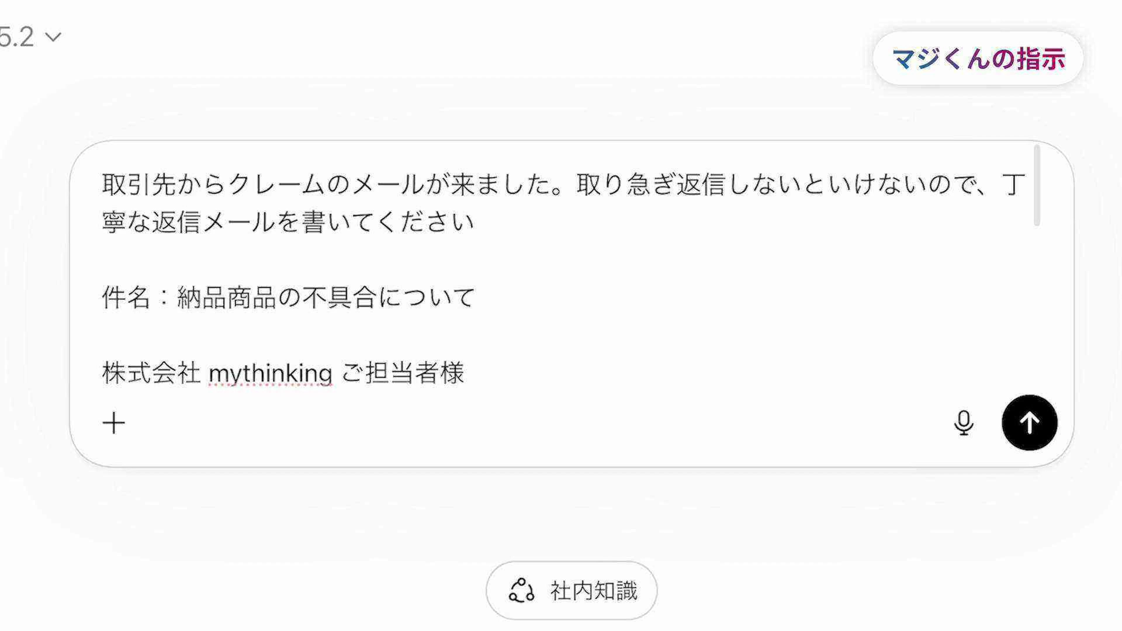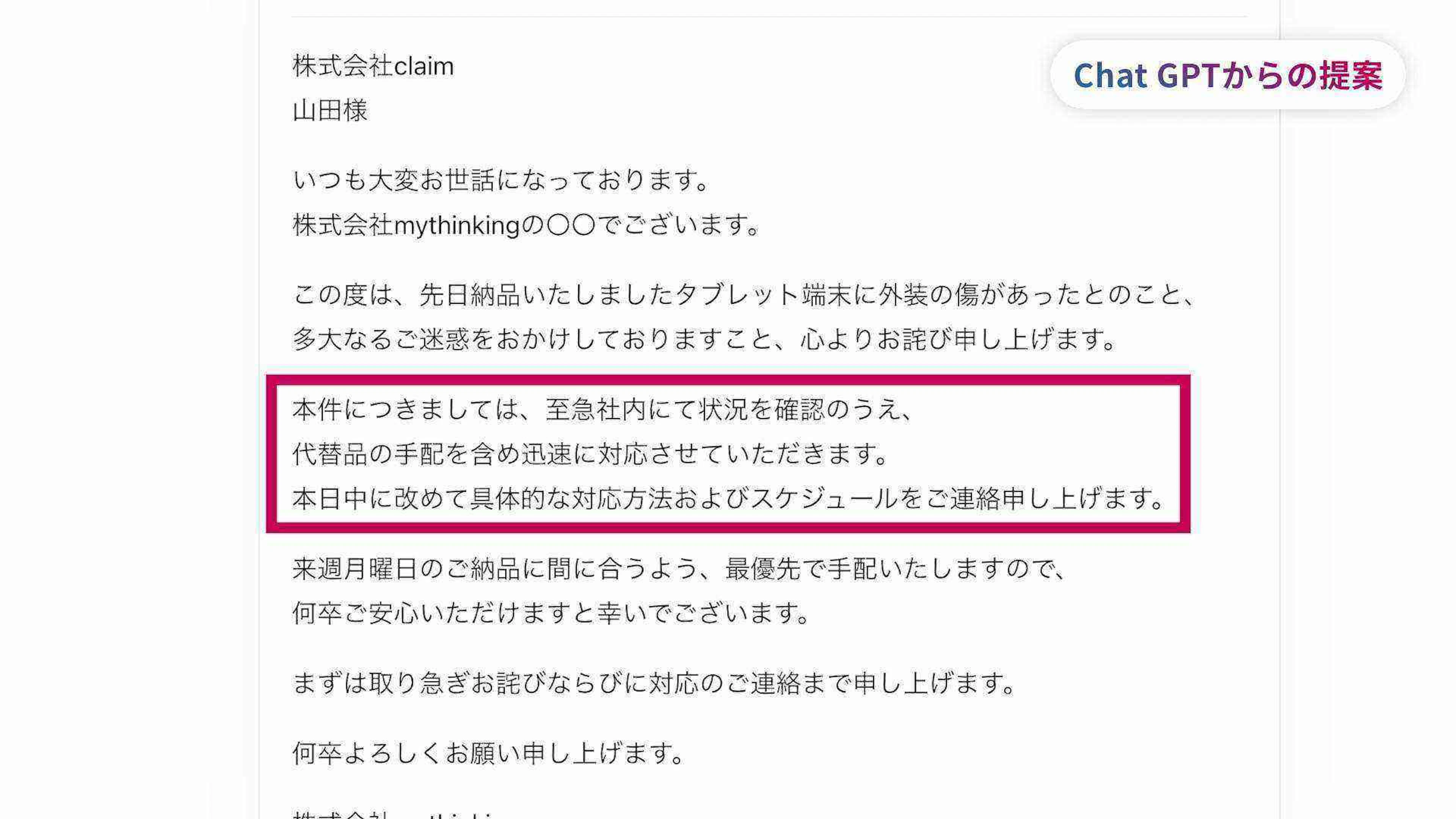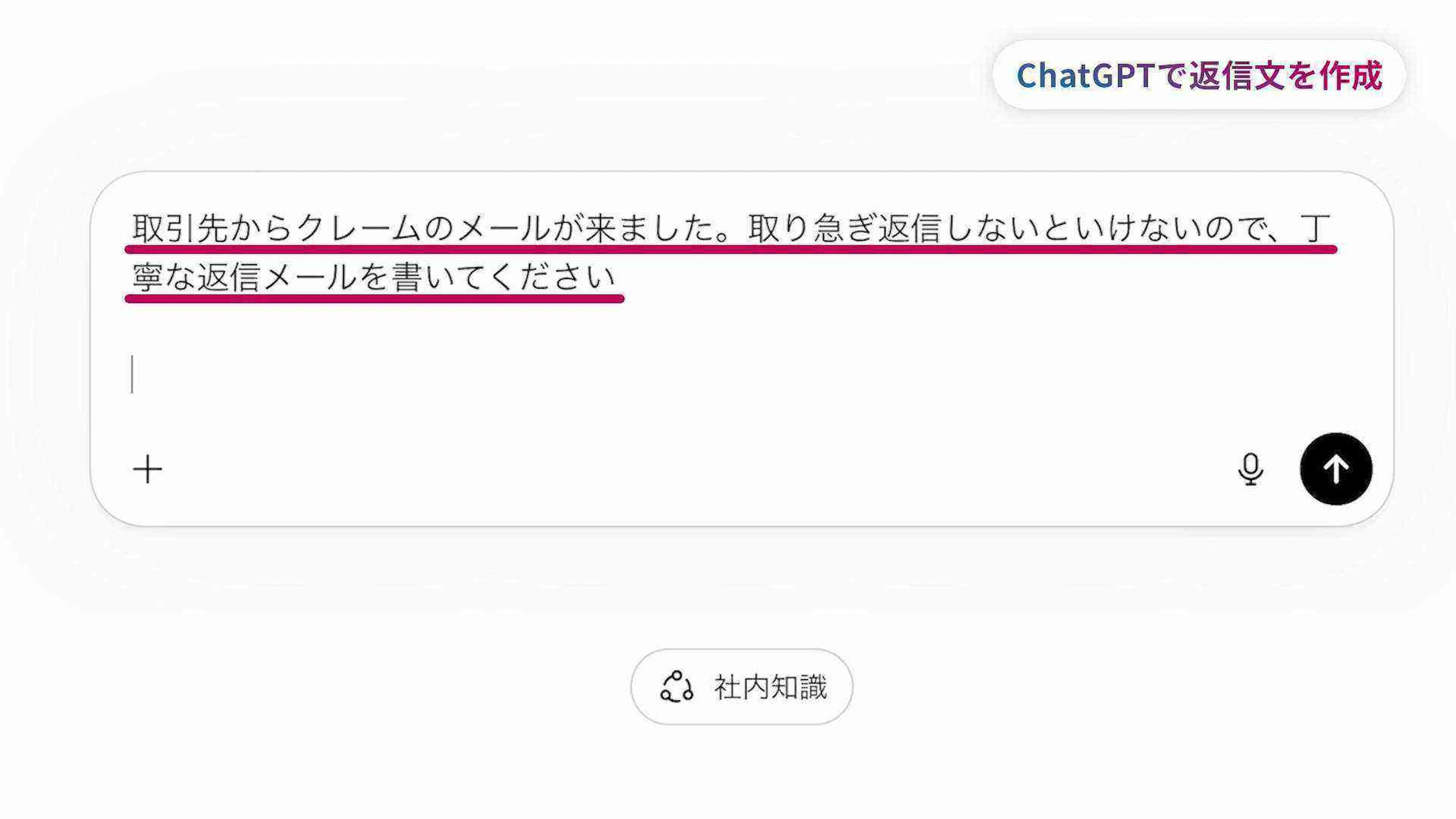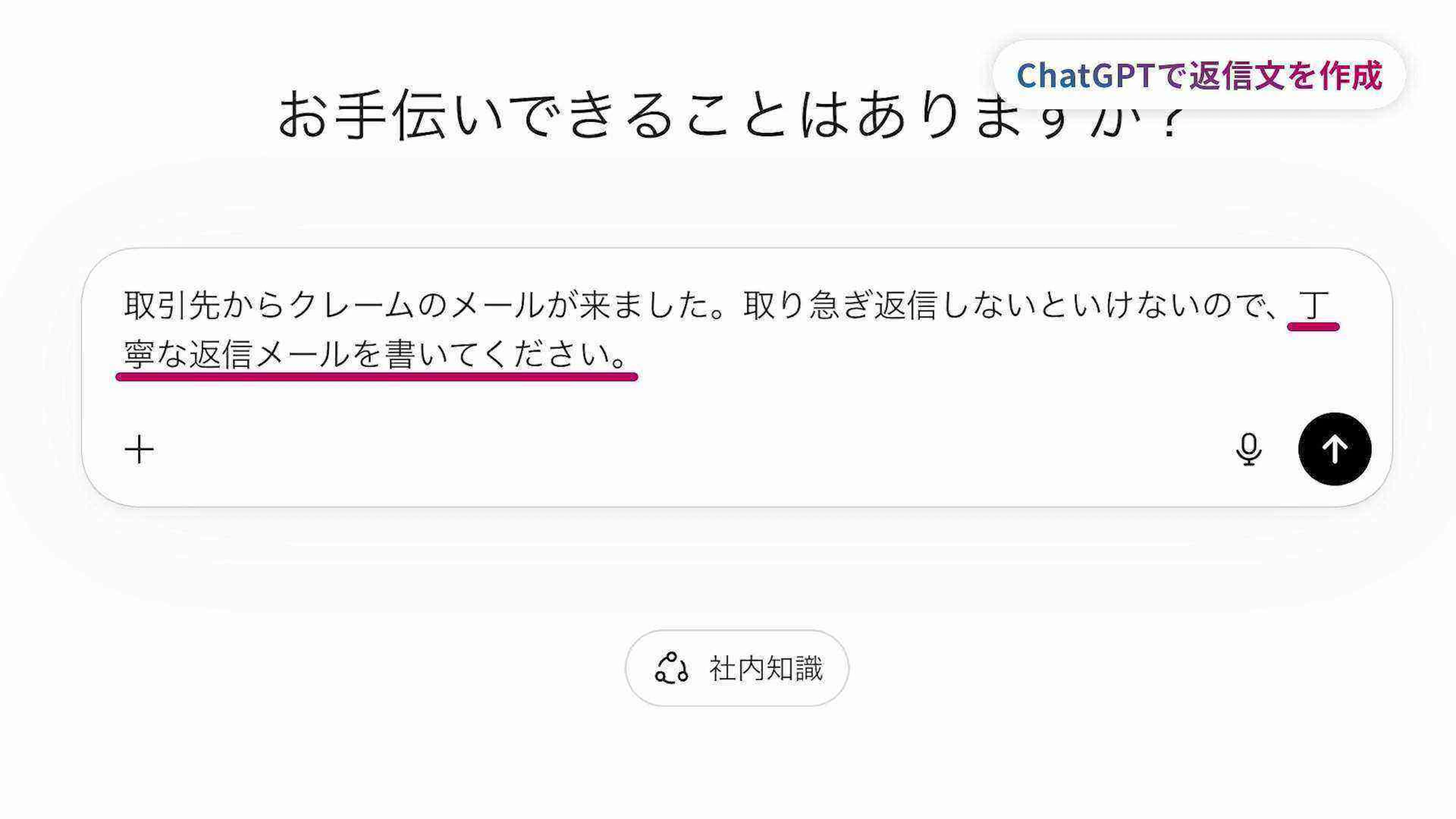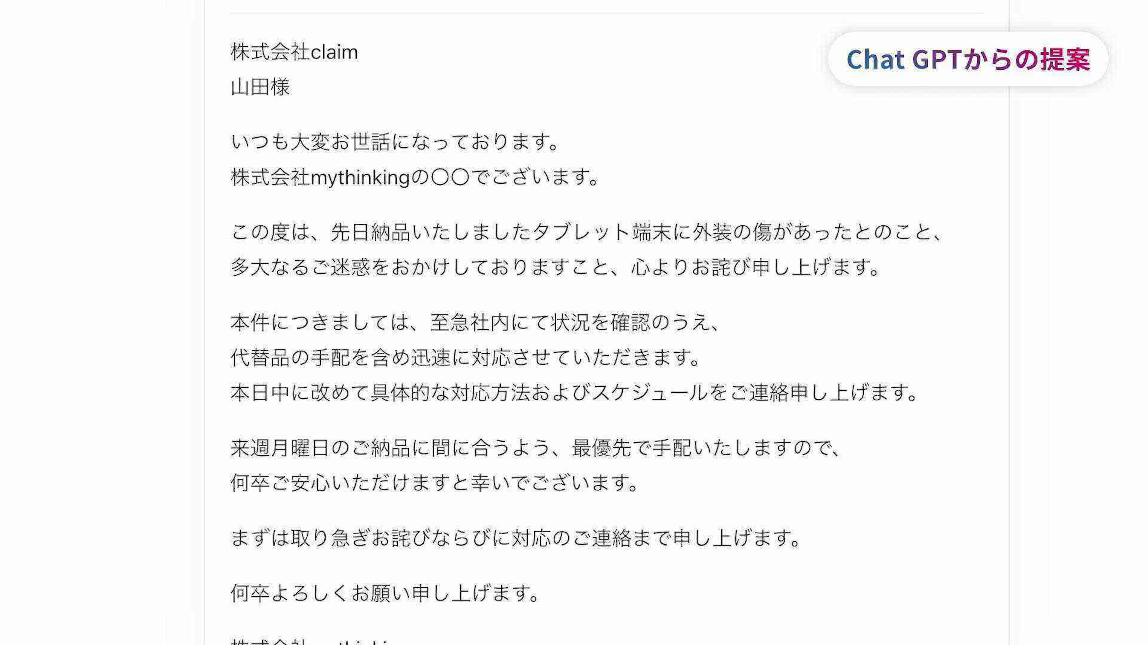 えっと...「取引先からクレームのメールが来ました。取り急ぎ返信しないといけないので、丁寧な返信メールを書いてください」っと。