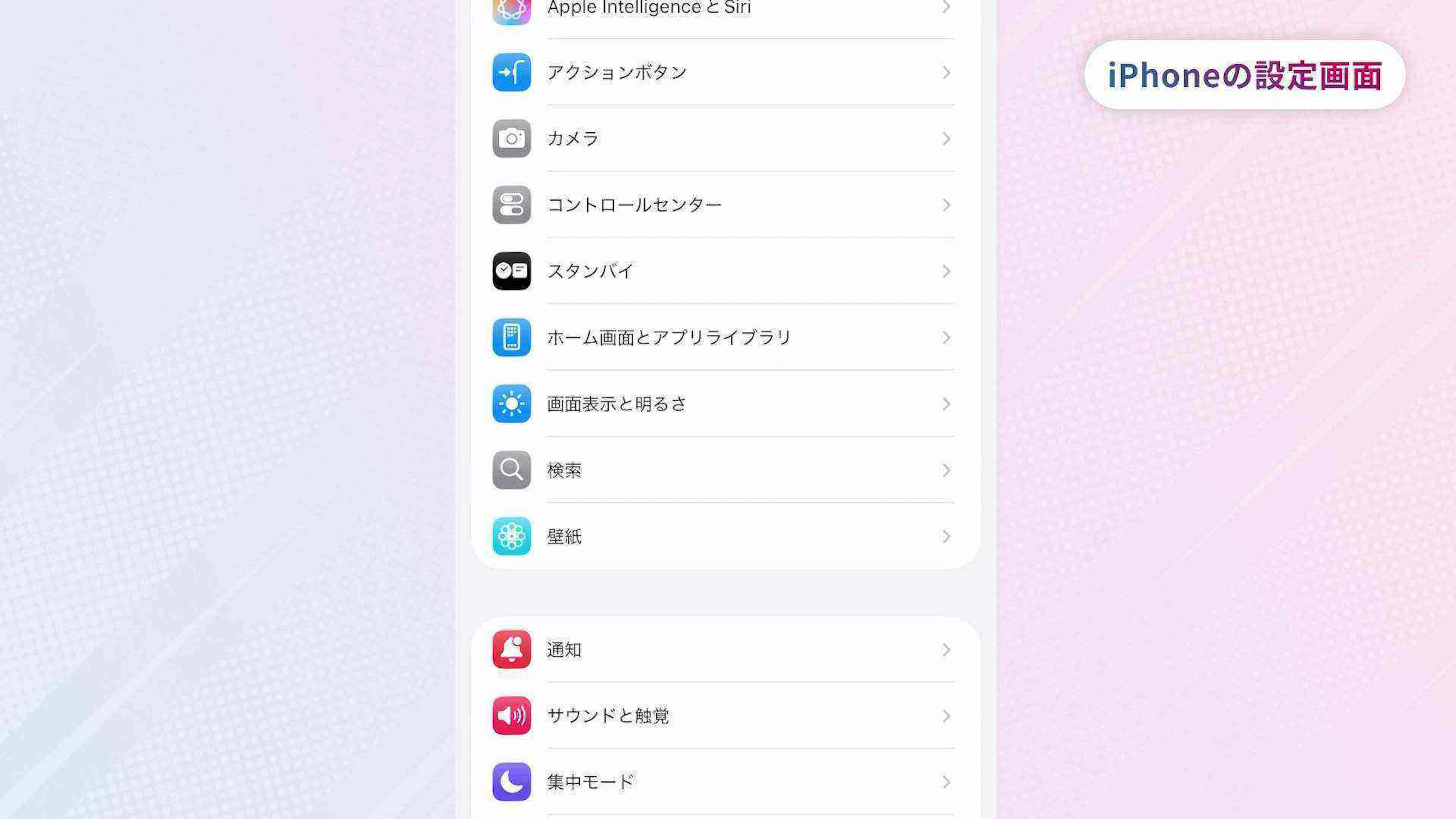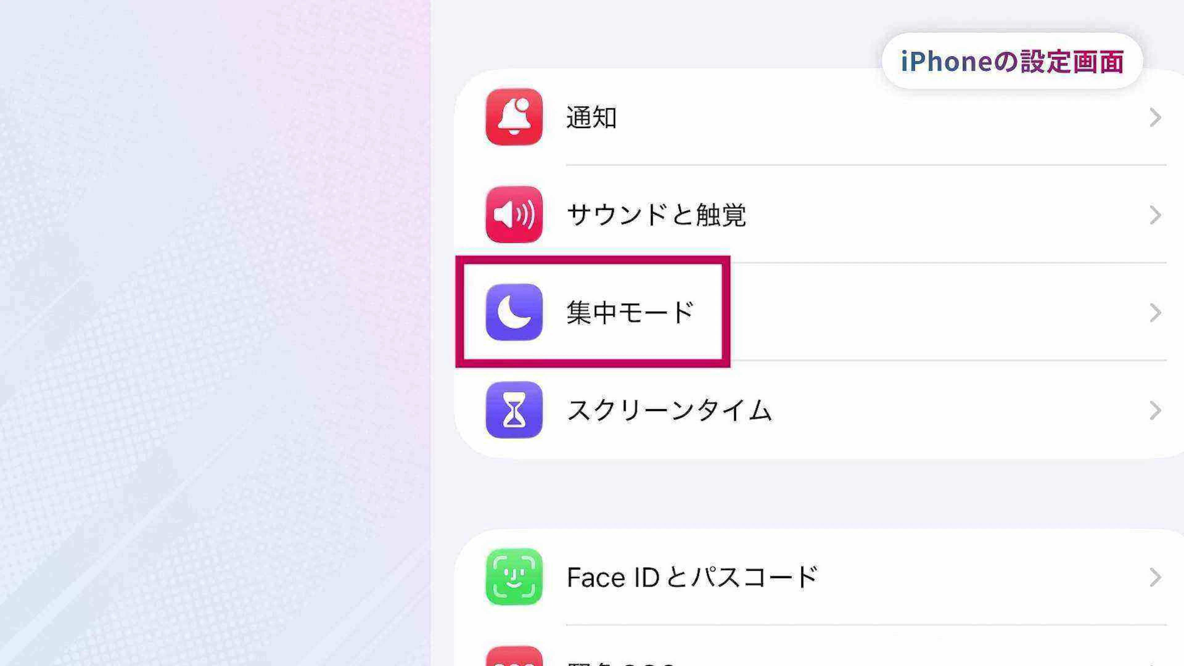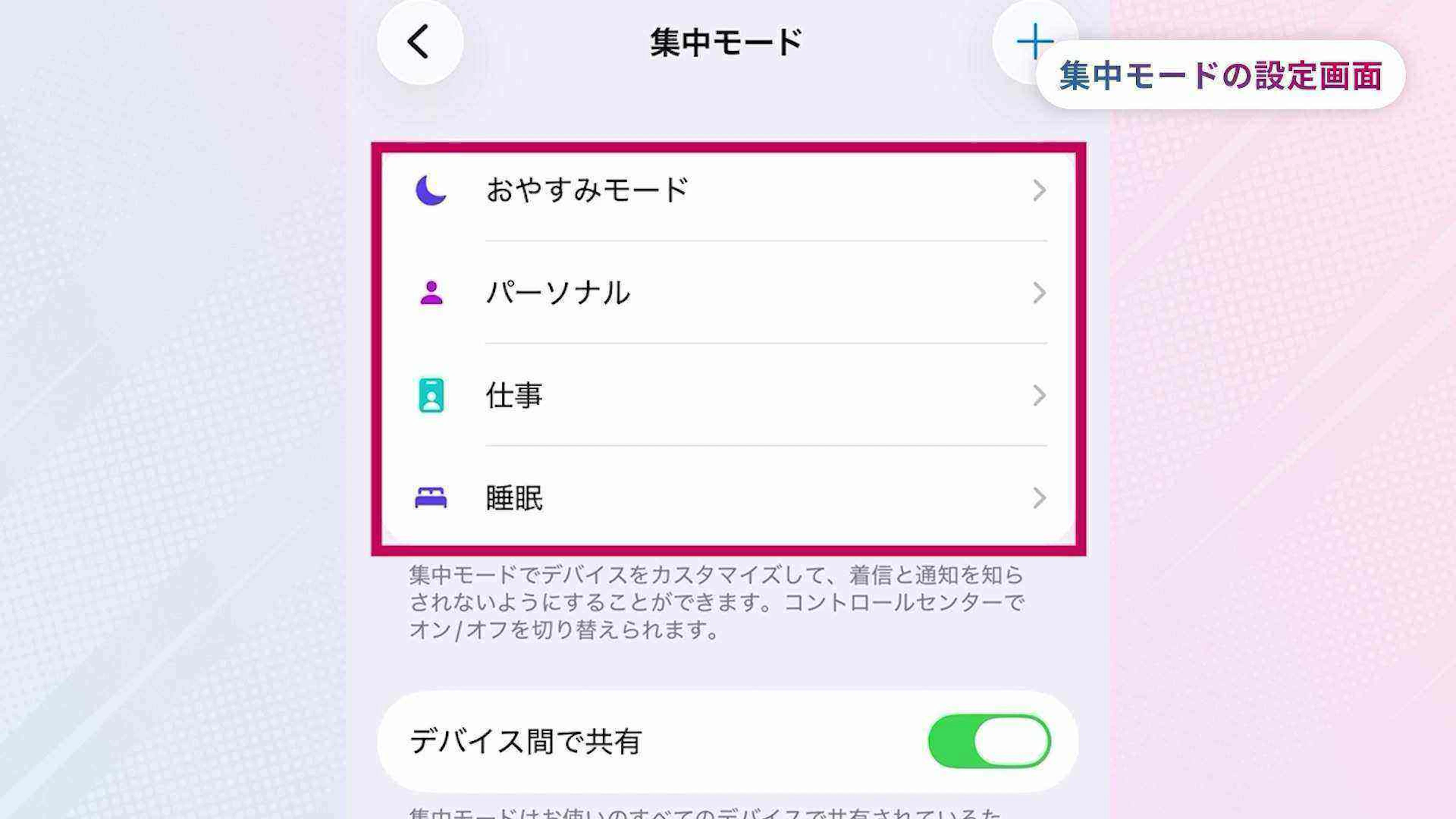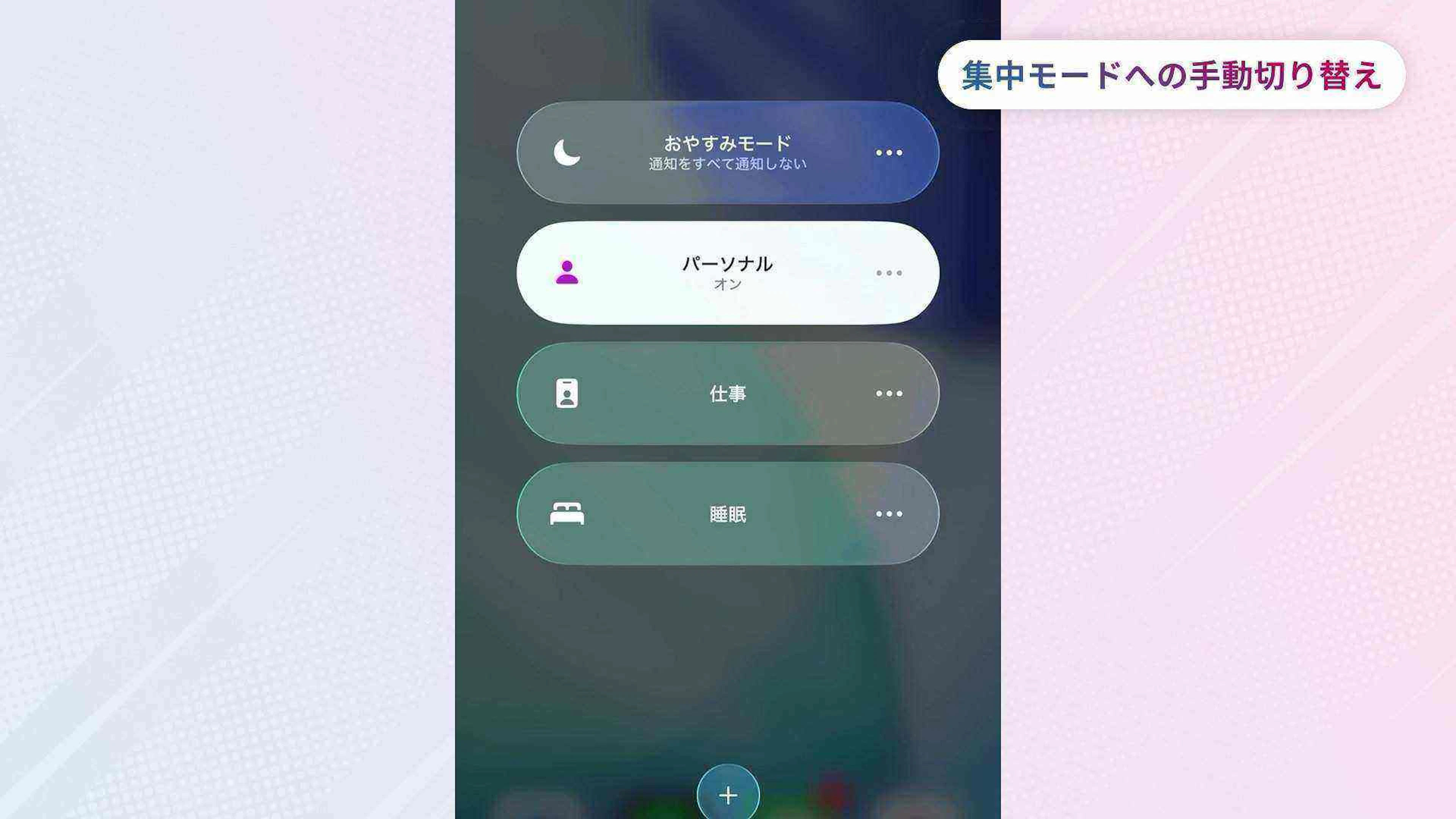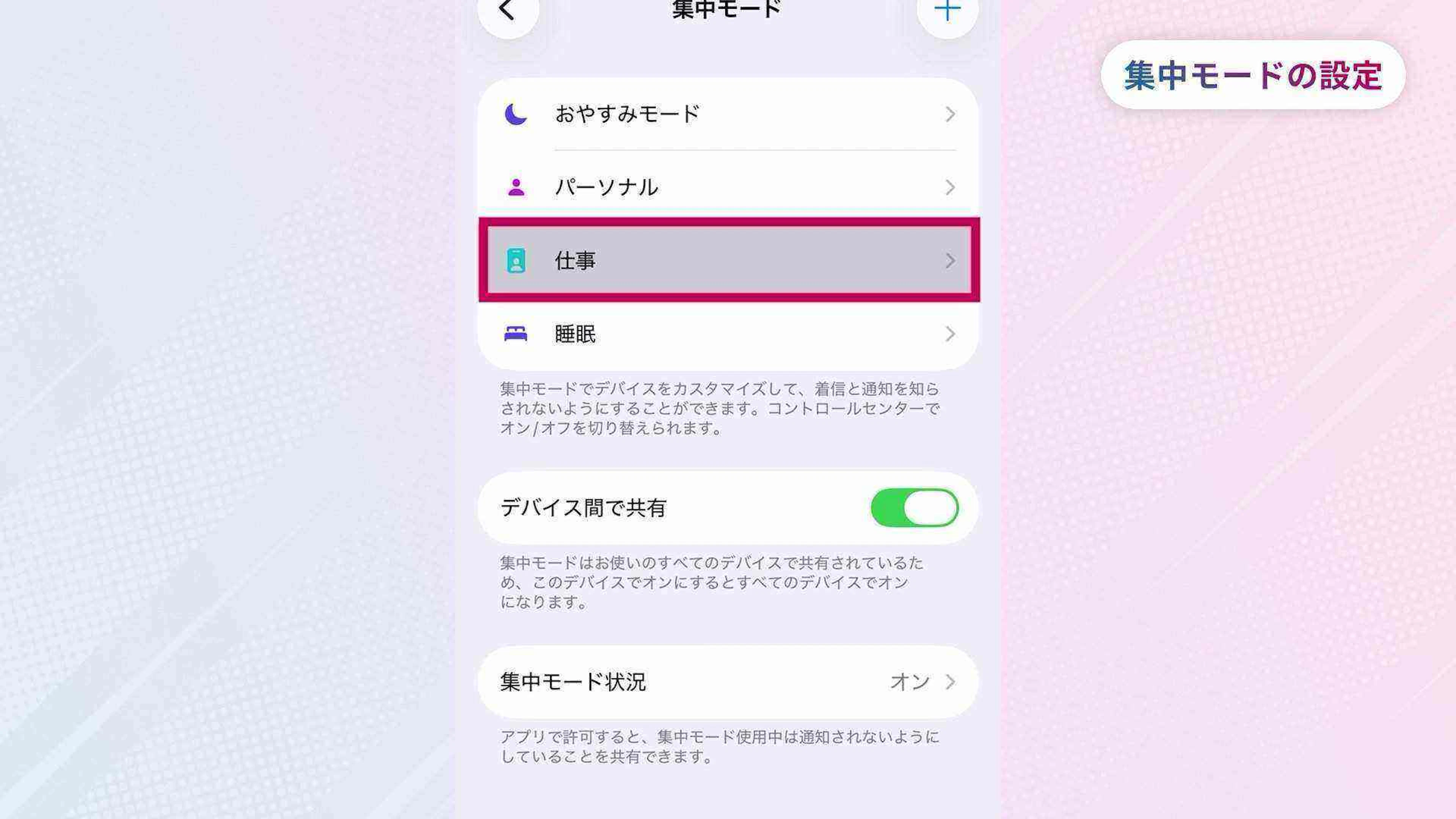 集中モードは、iPhoneのおやすみモードなどが入っている、通知や画面に表示するものをカスタマイズできる機能のことです。