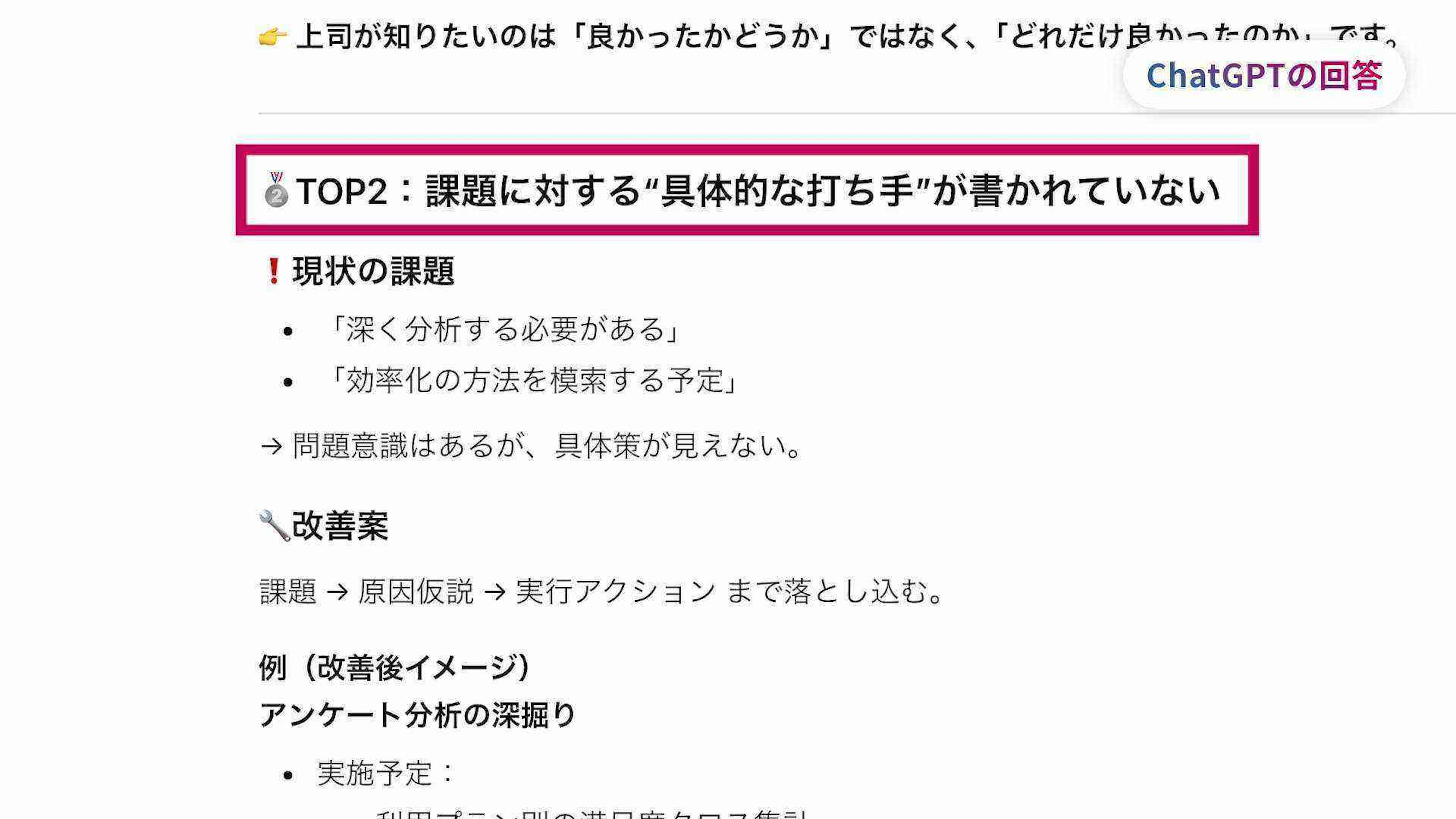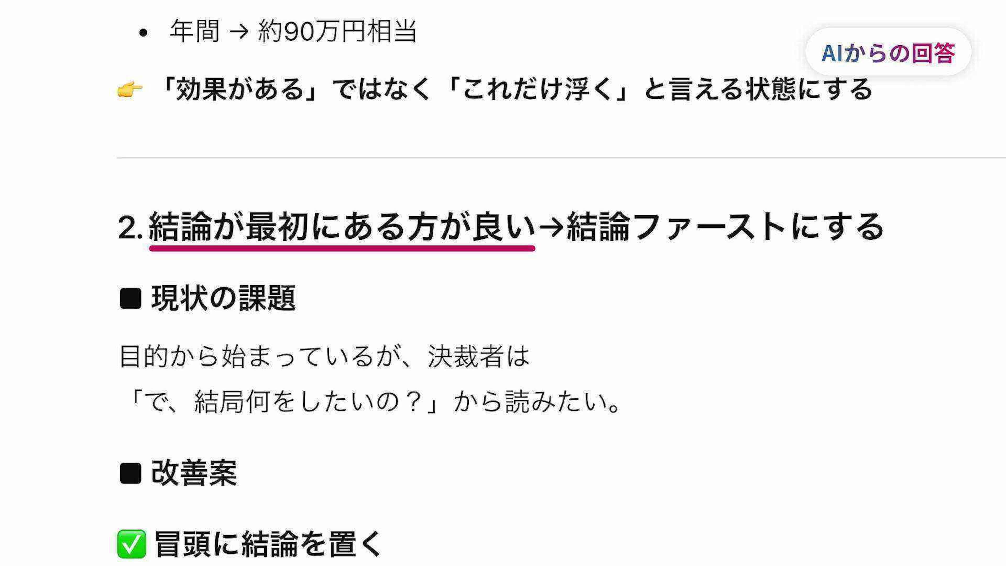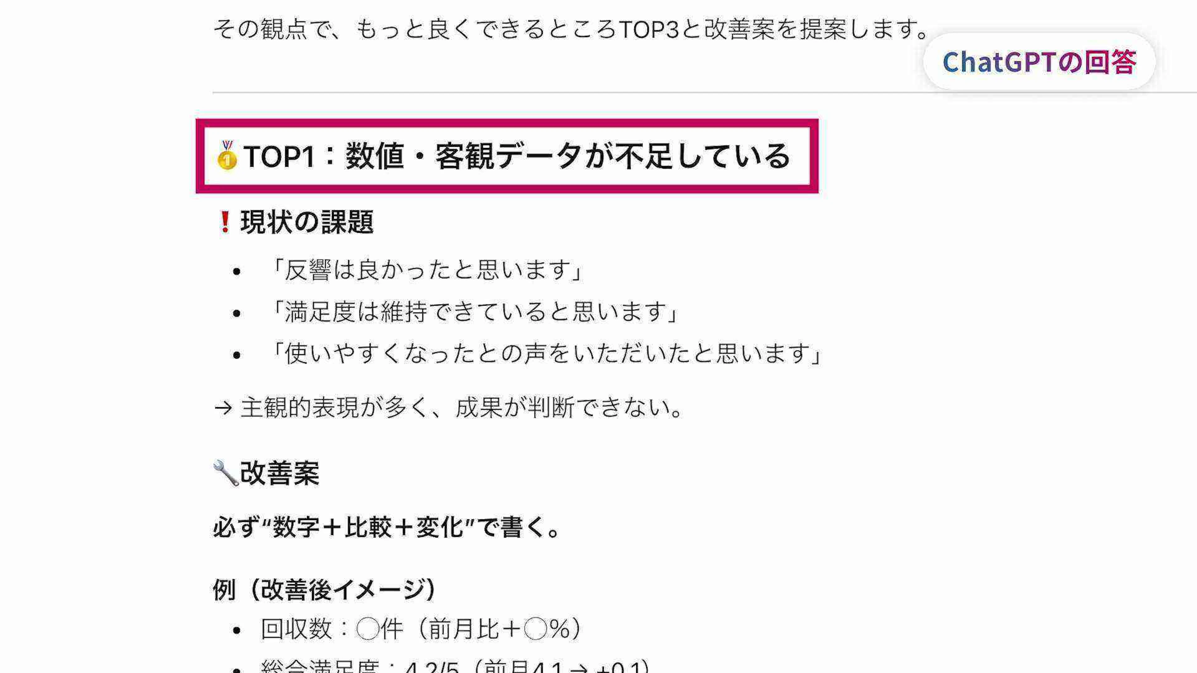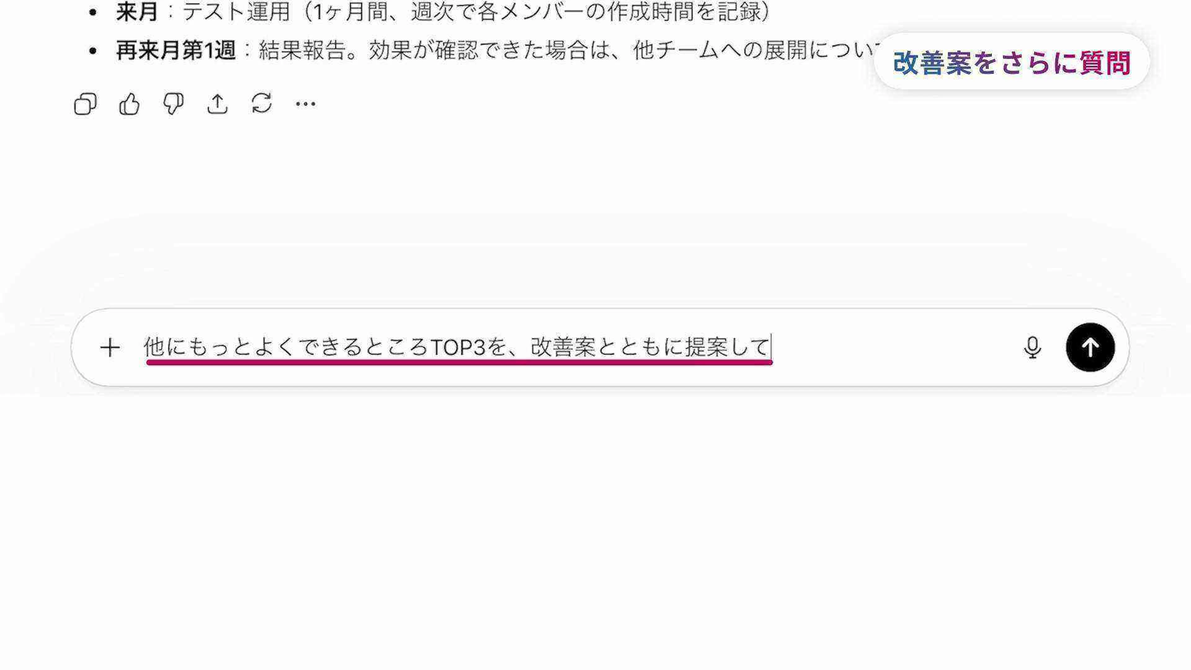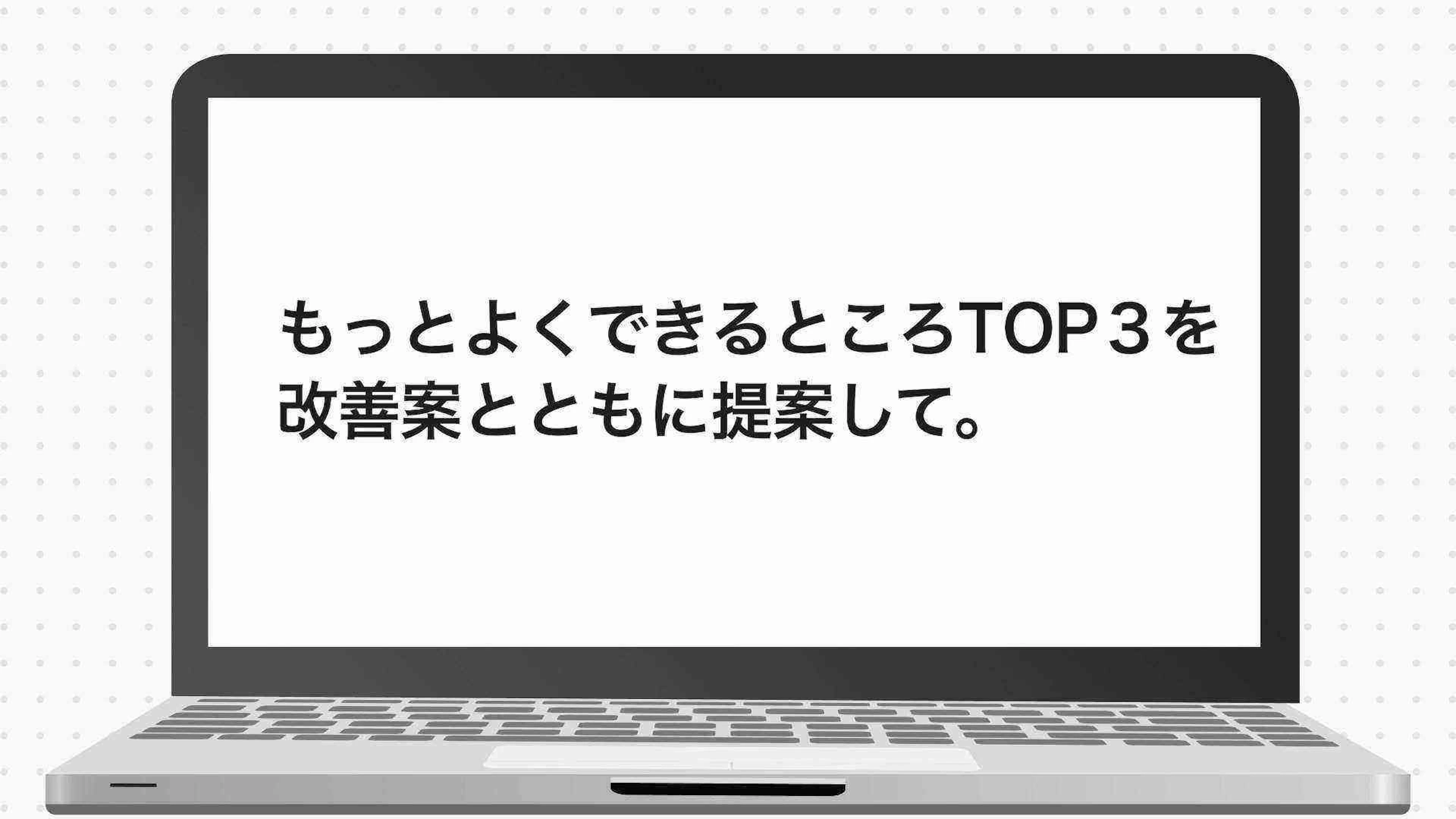 明日の仕事で、9位で紹介した「もっとよくできるところTOP3を改善案とともに提案して」のフレーズをAIに伝えて、AIからフィードバックをもらってみてください。
