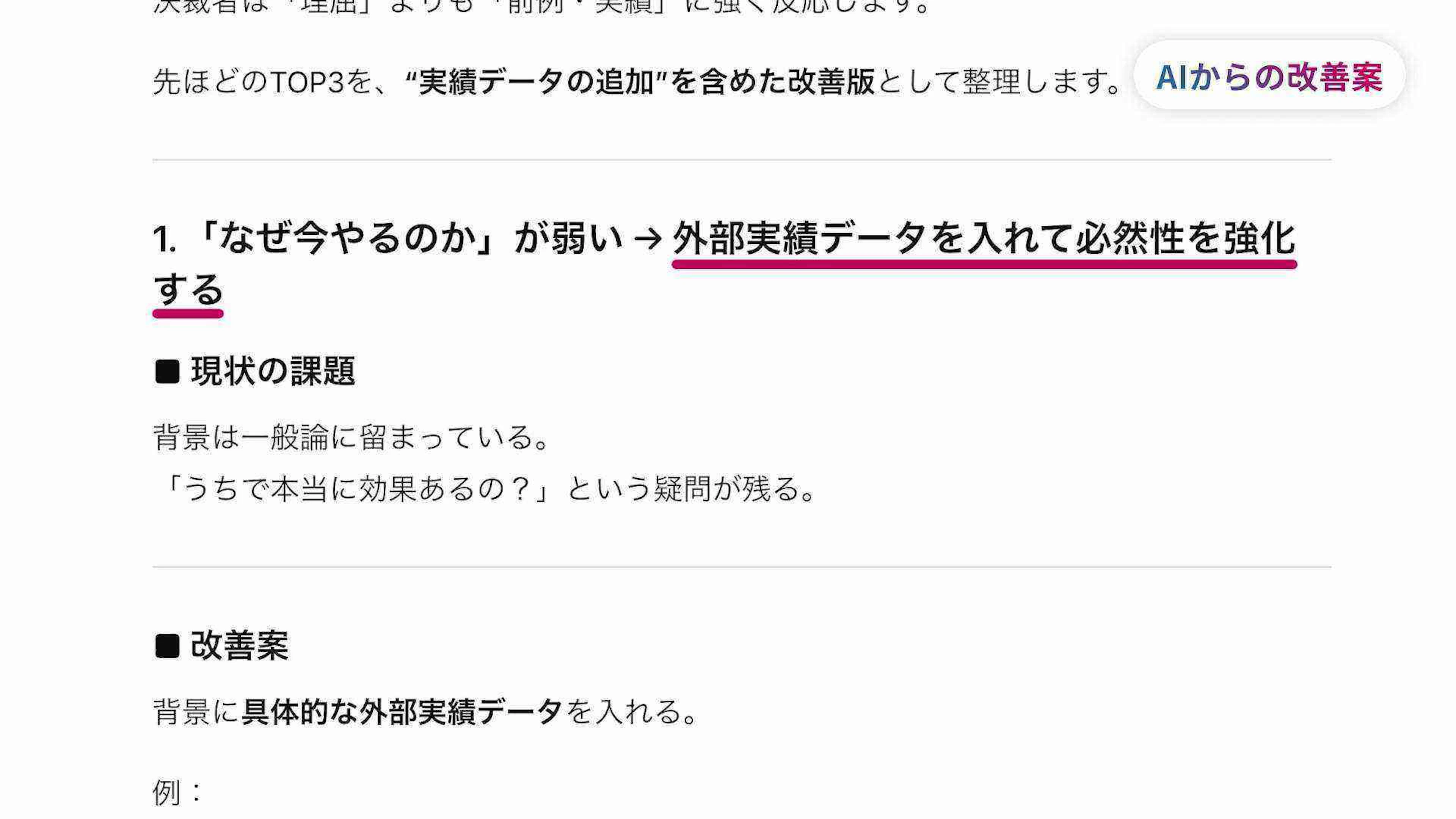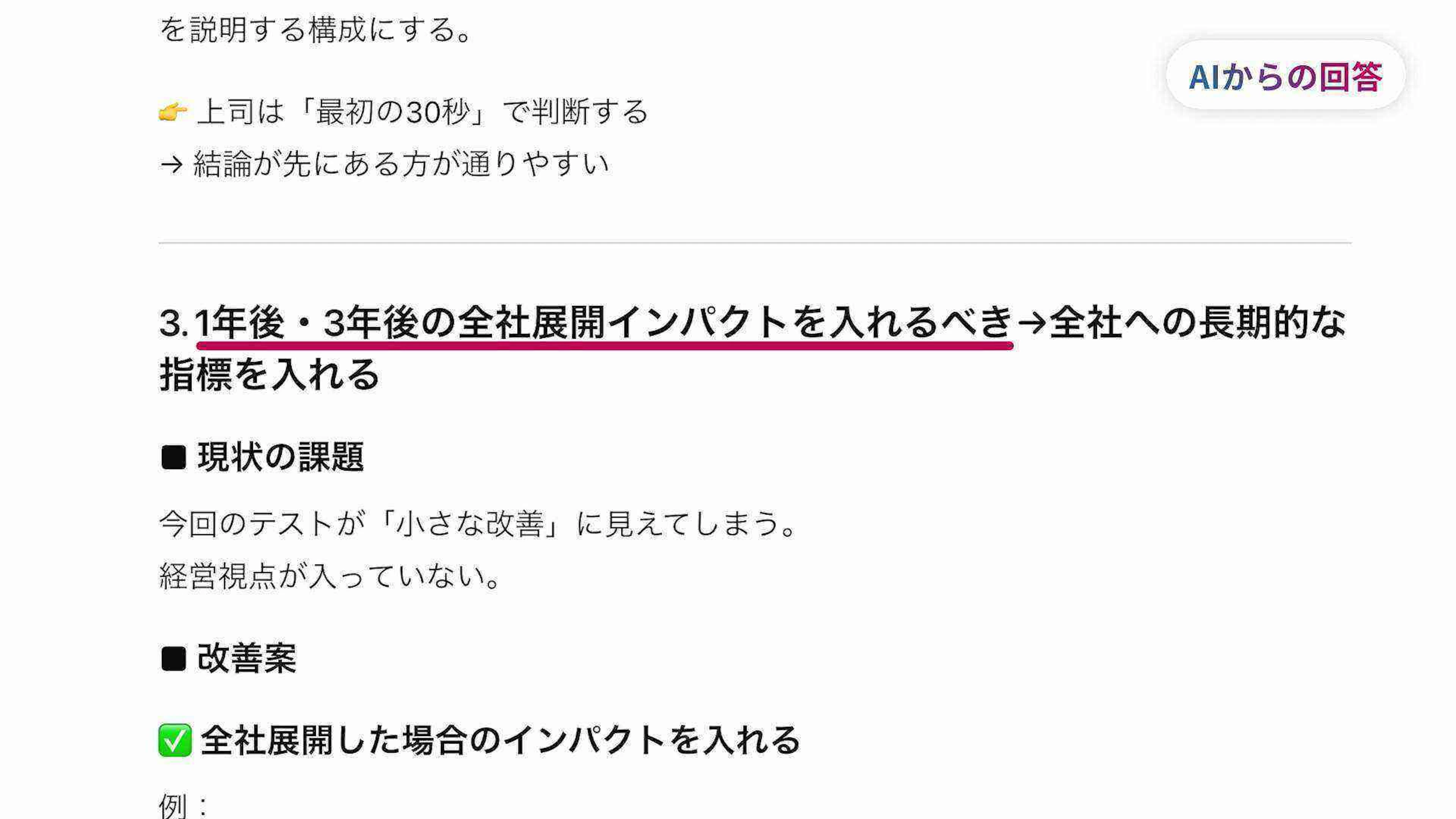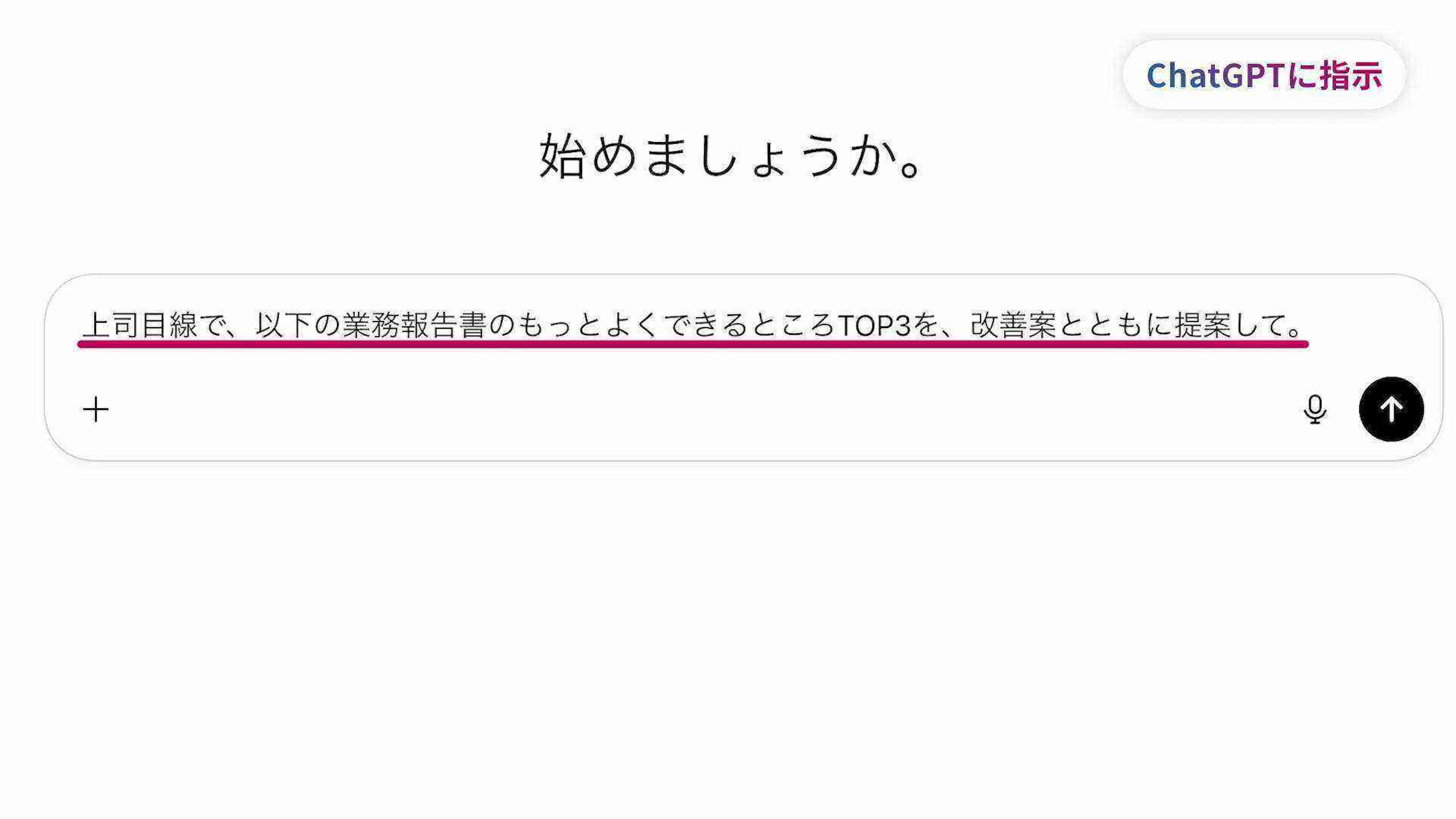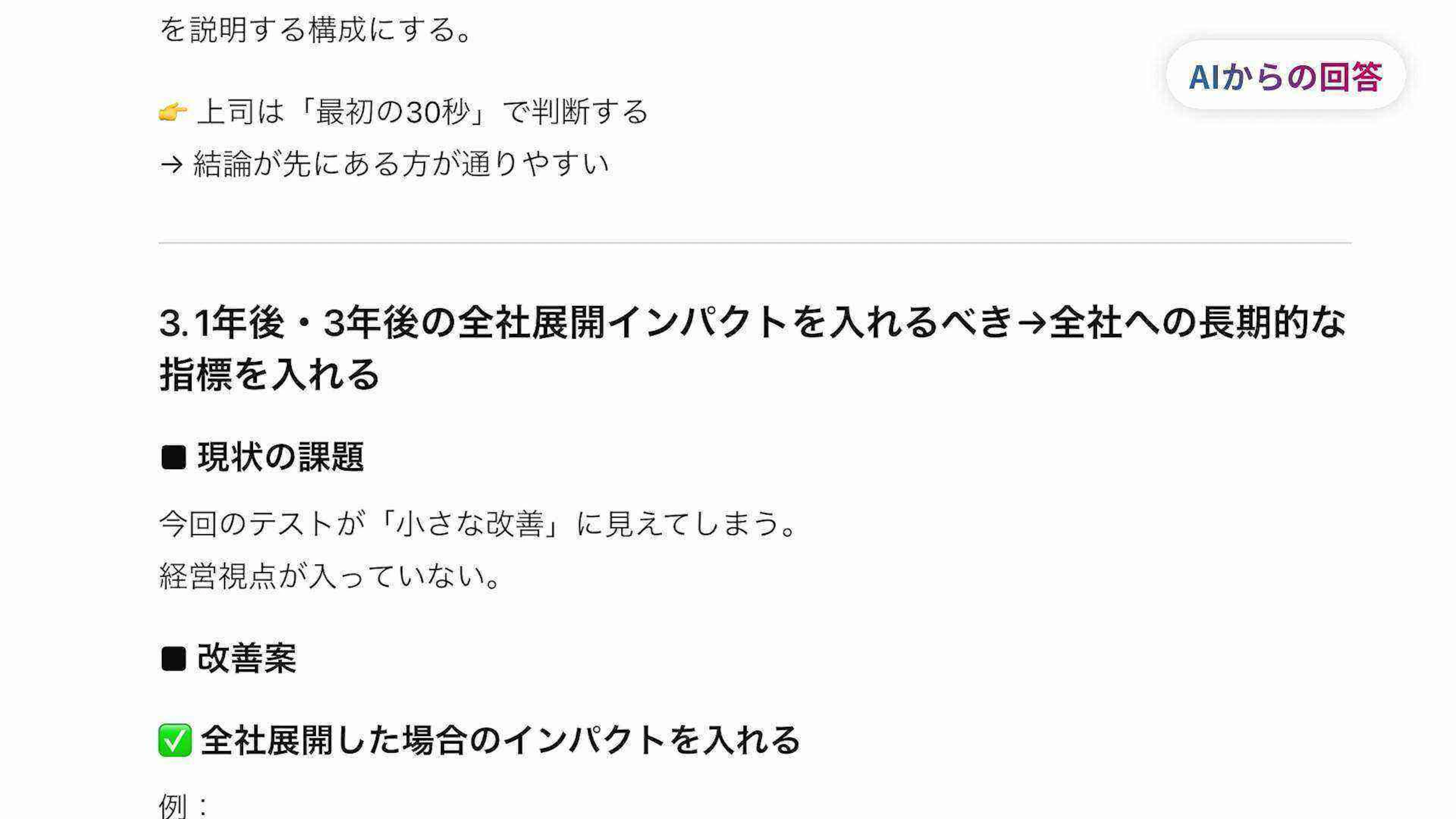 明日の仕事で、9位で紹介した「もっとよくできるところTOP3を改善案とともに提案して」のフレーズをAIに伝えて、AIからフィードバックをもらってみてください。