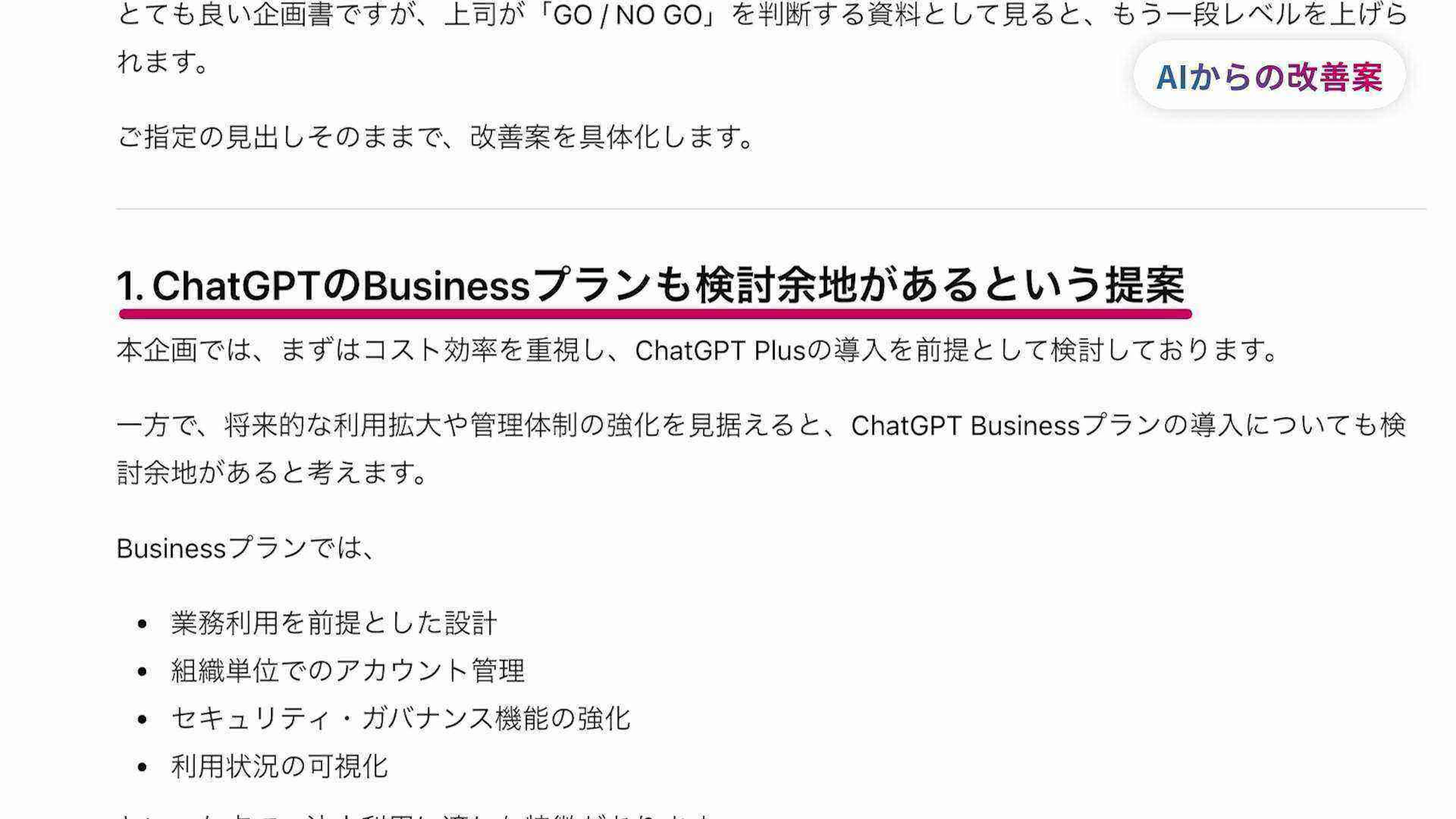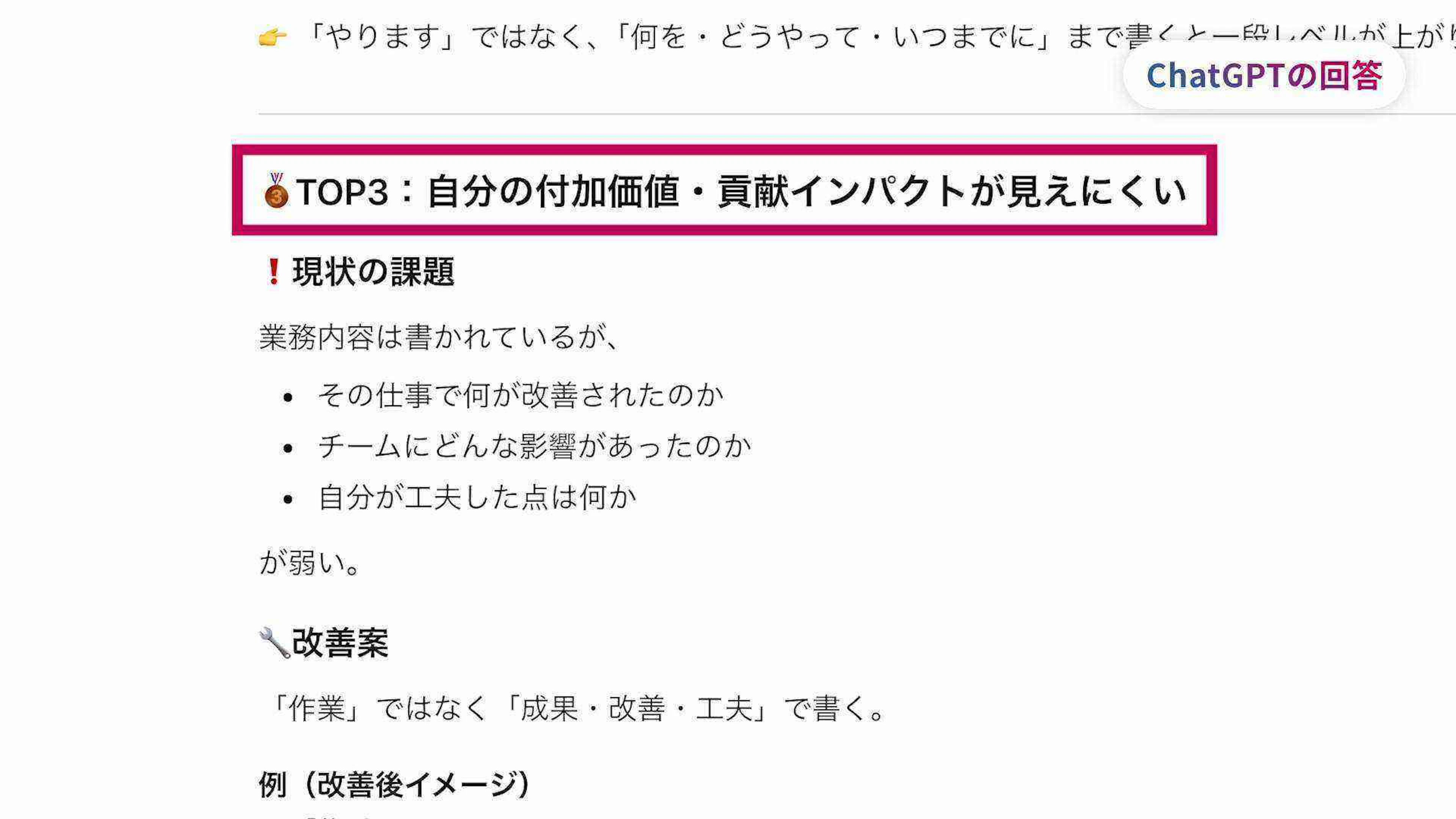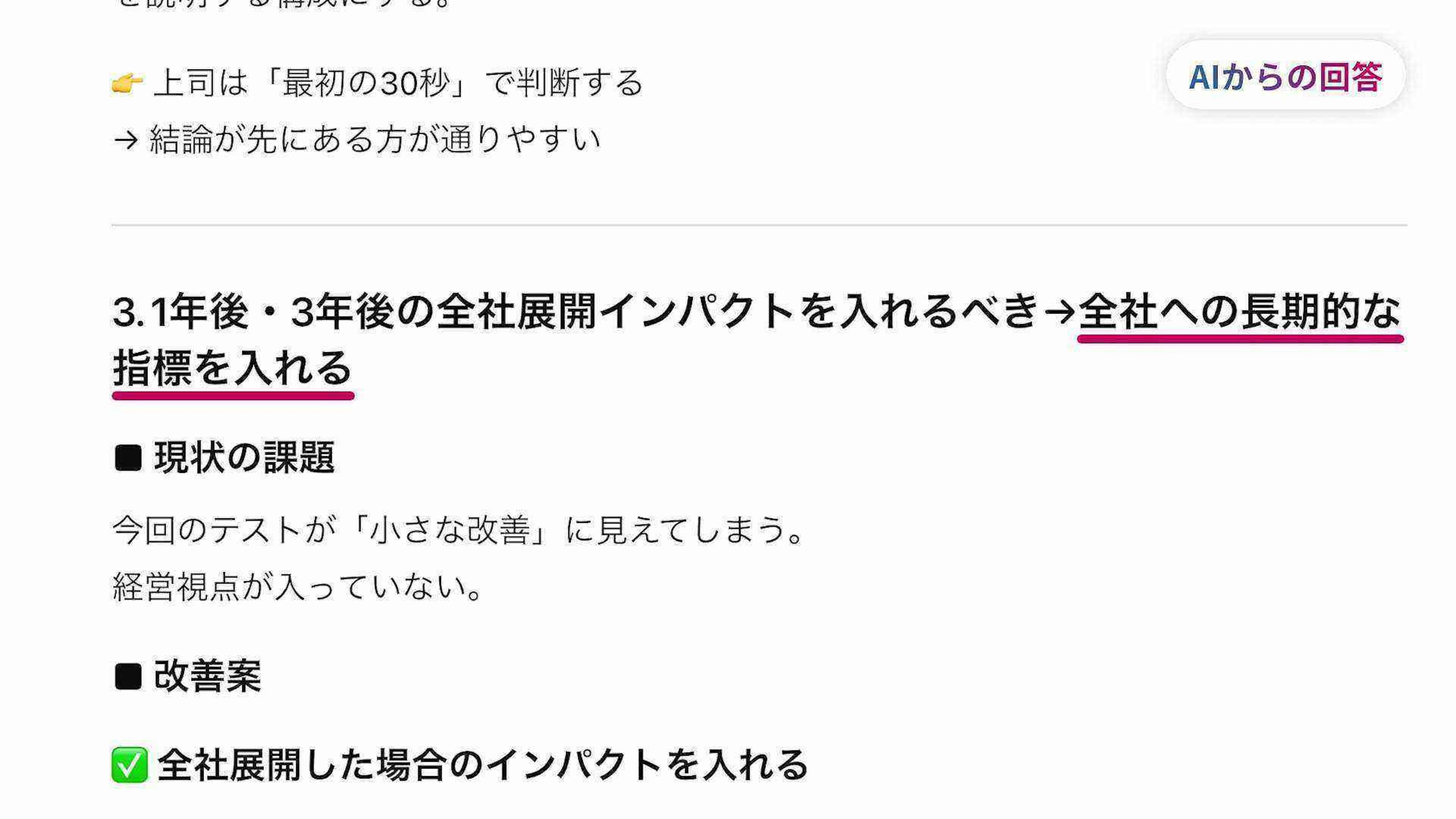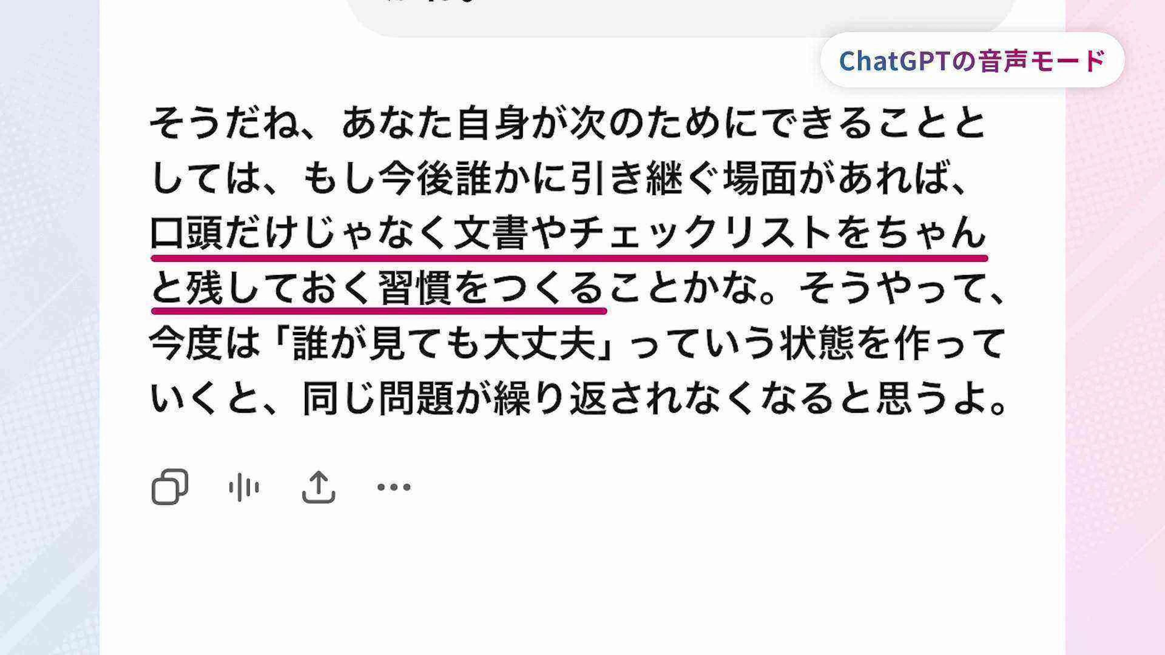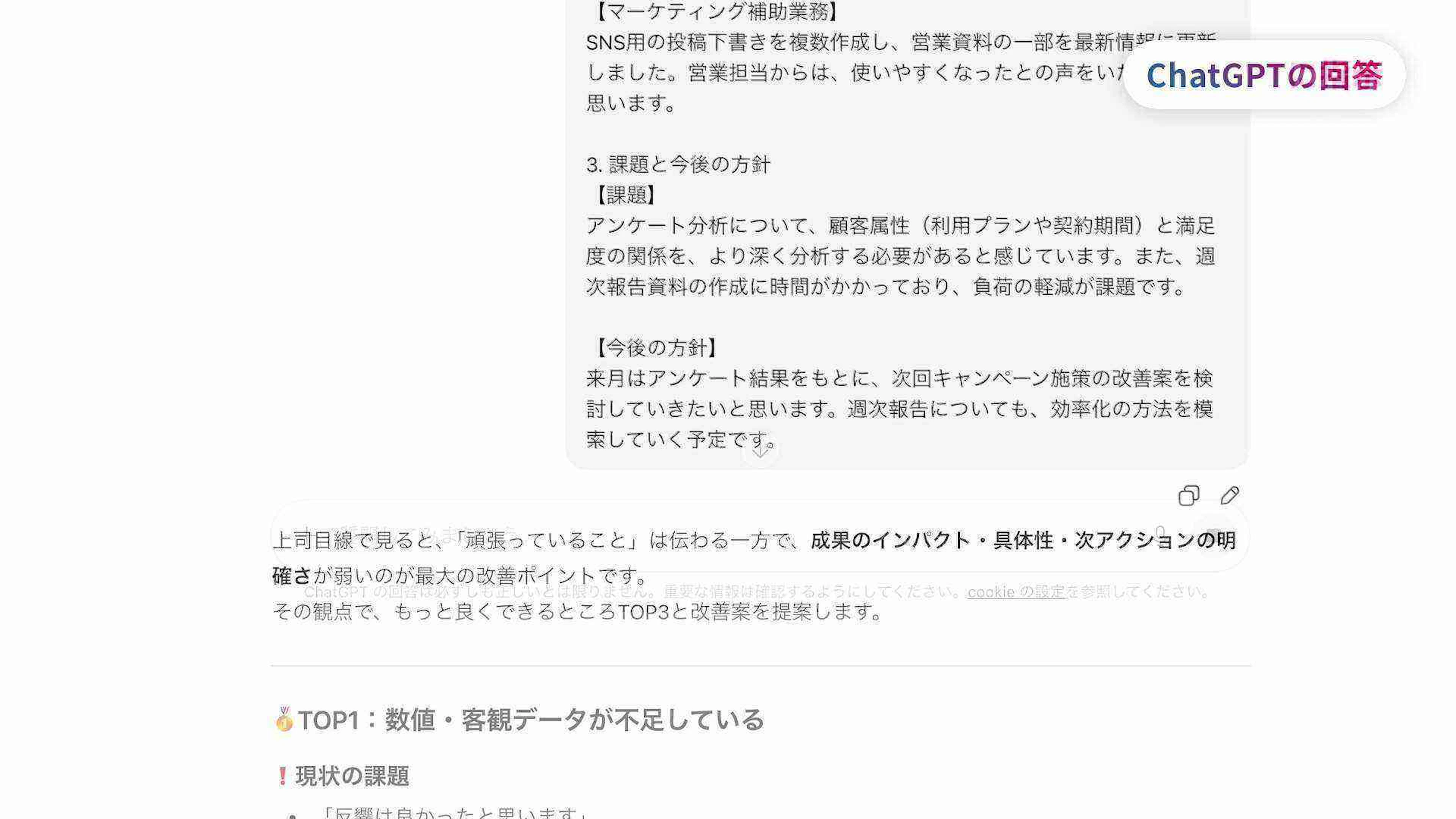 明日の仕事で、9位で紹介した「もっとよくできるところTOP3を改善案とともに提案して」のフレーズをAIに伝えて、AIからフィードバックをもらってみてください。