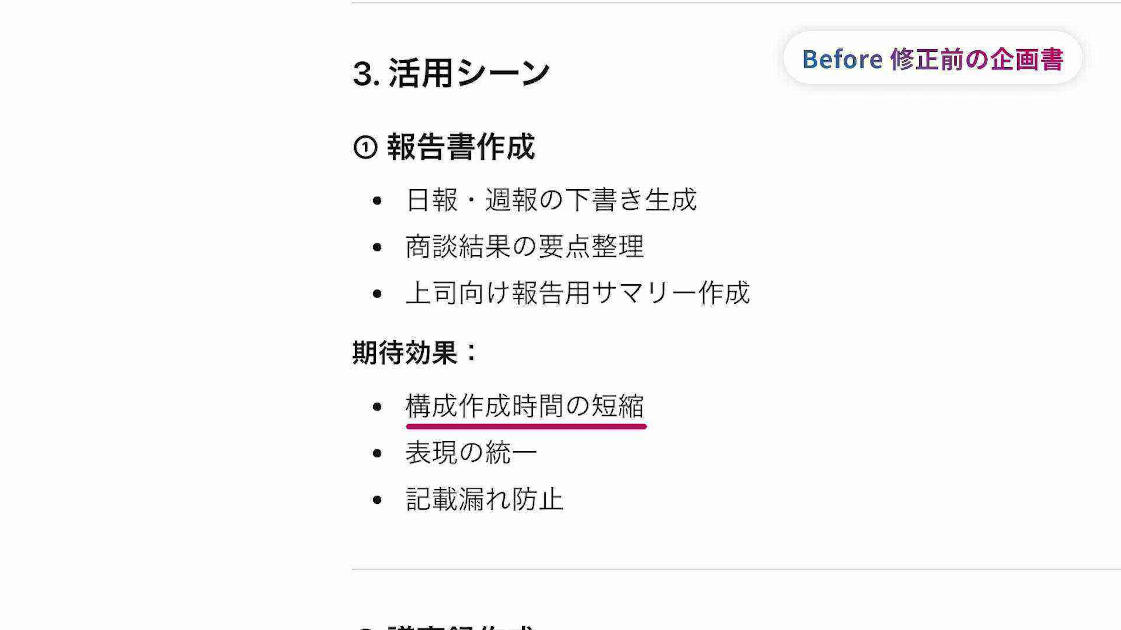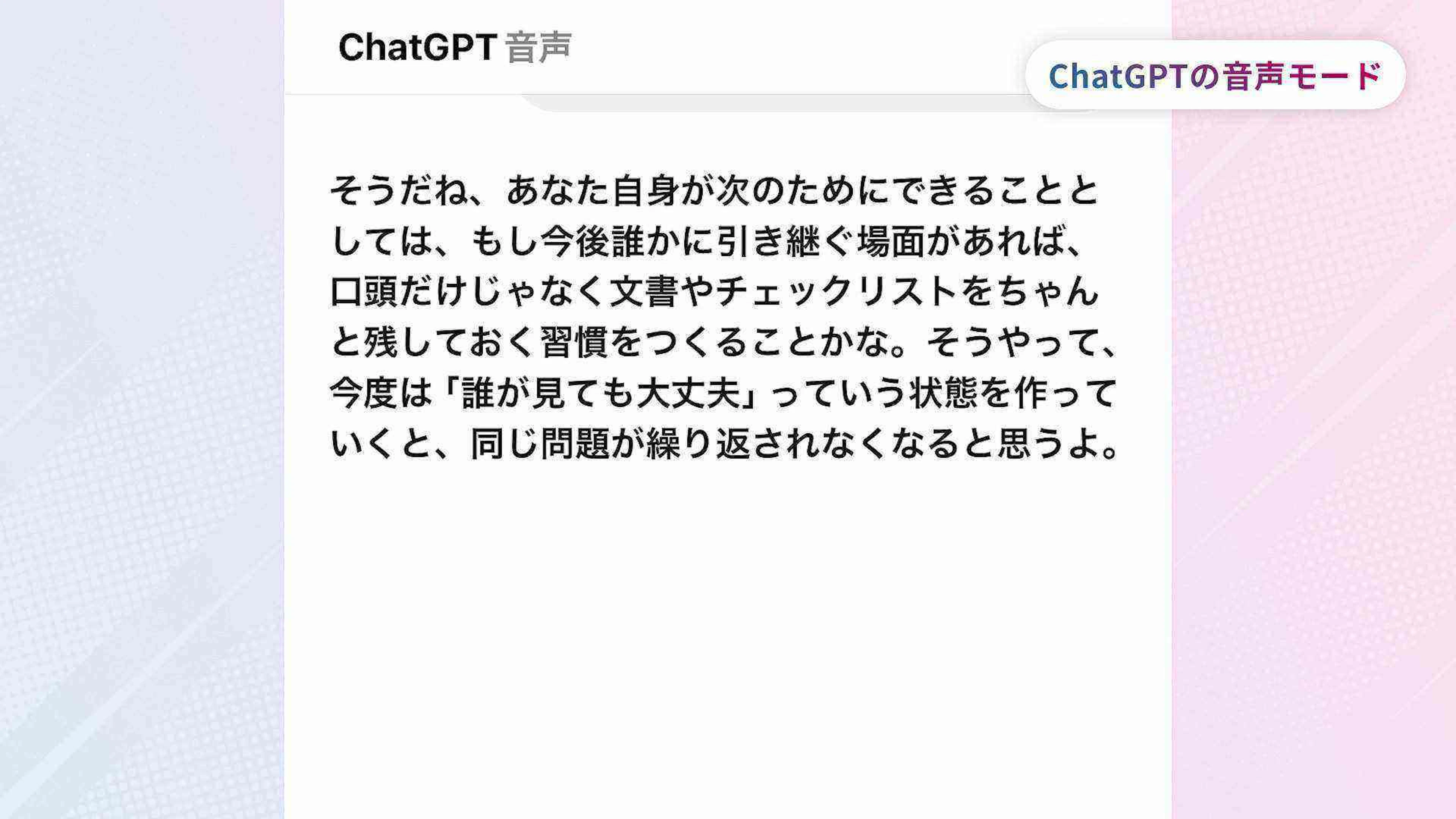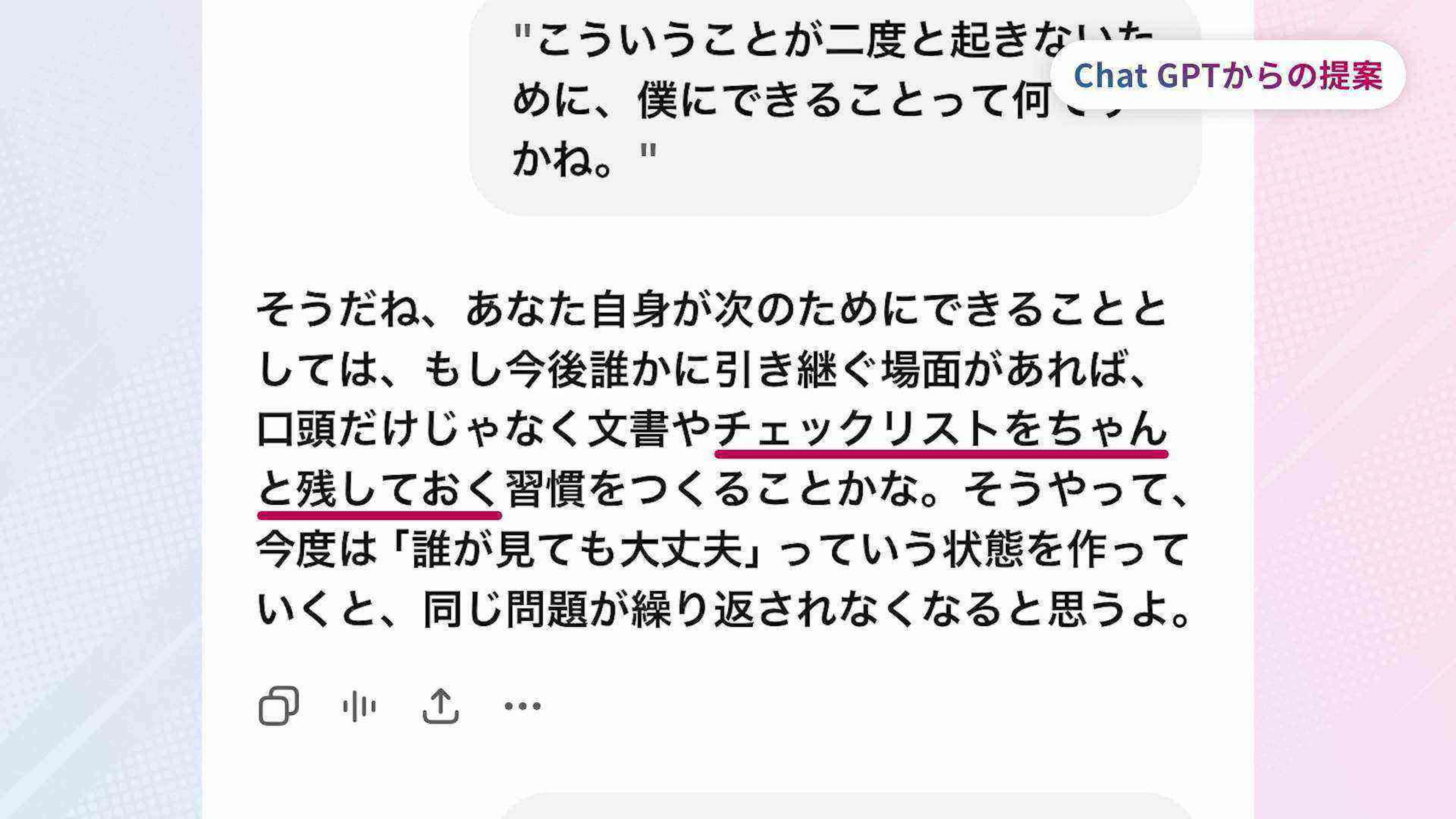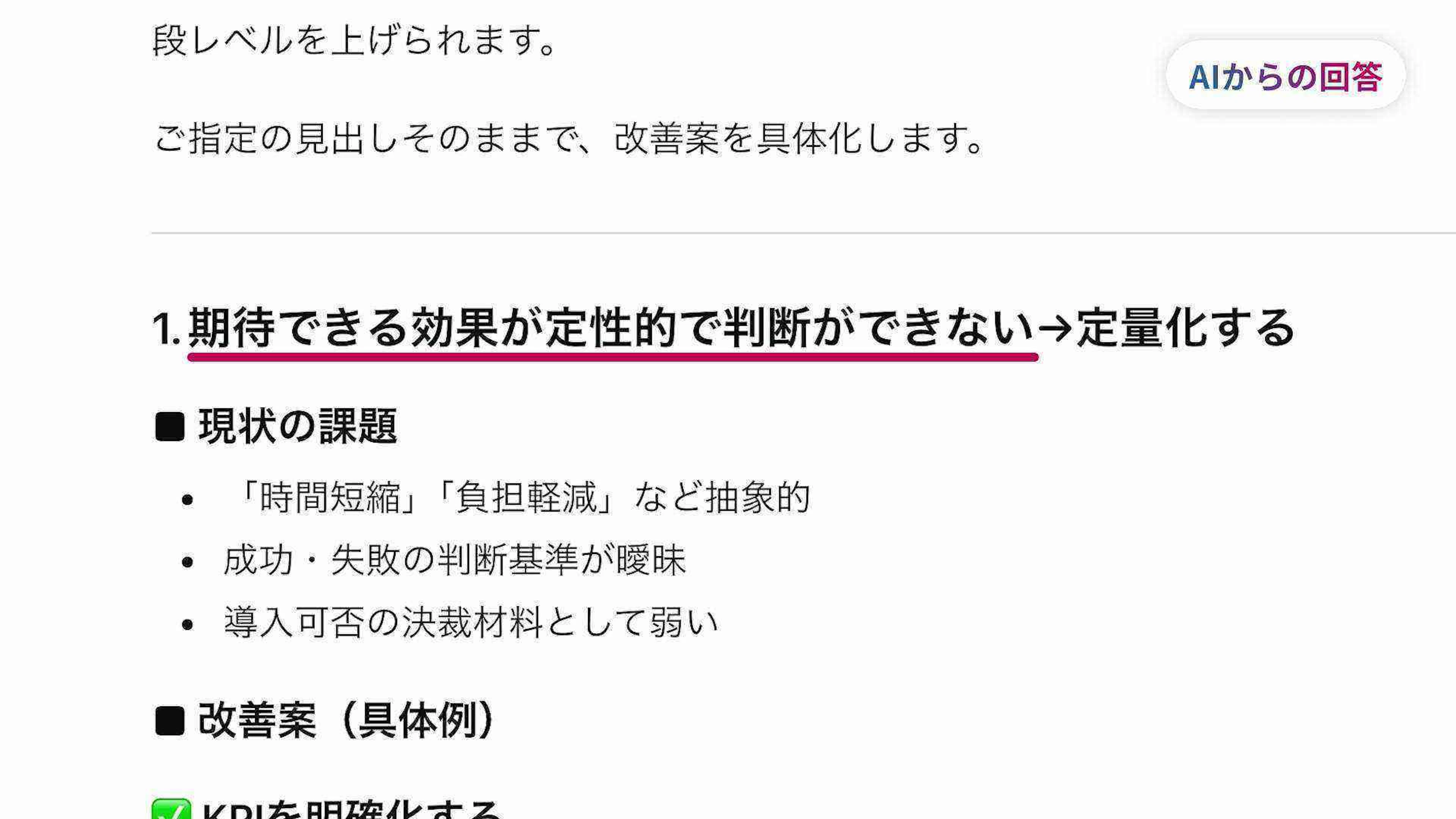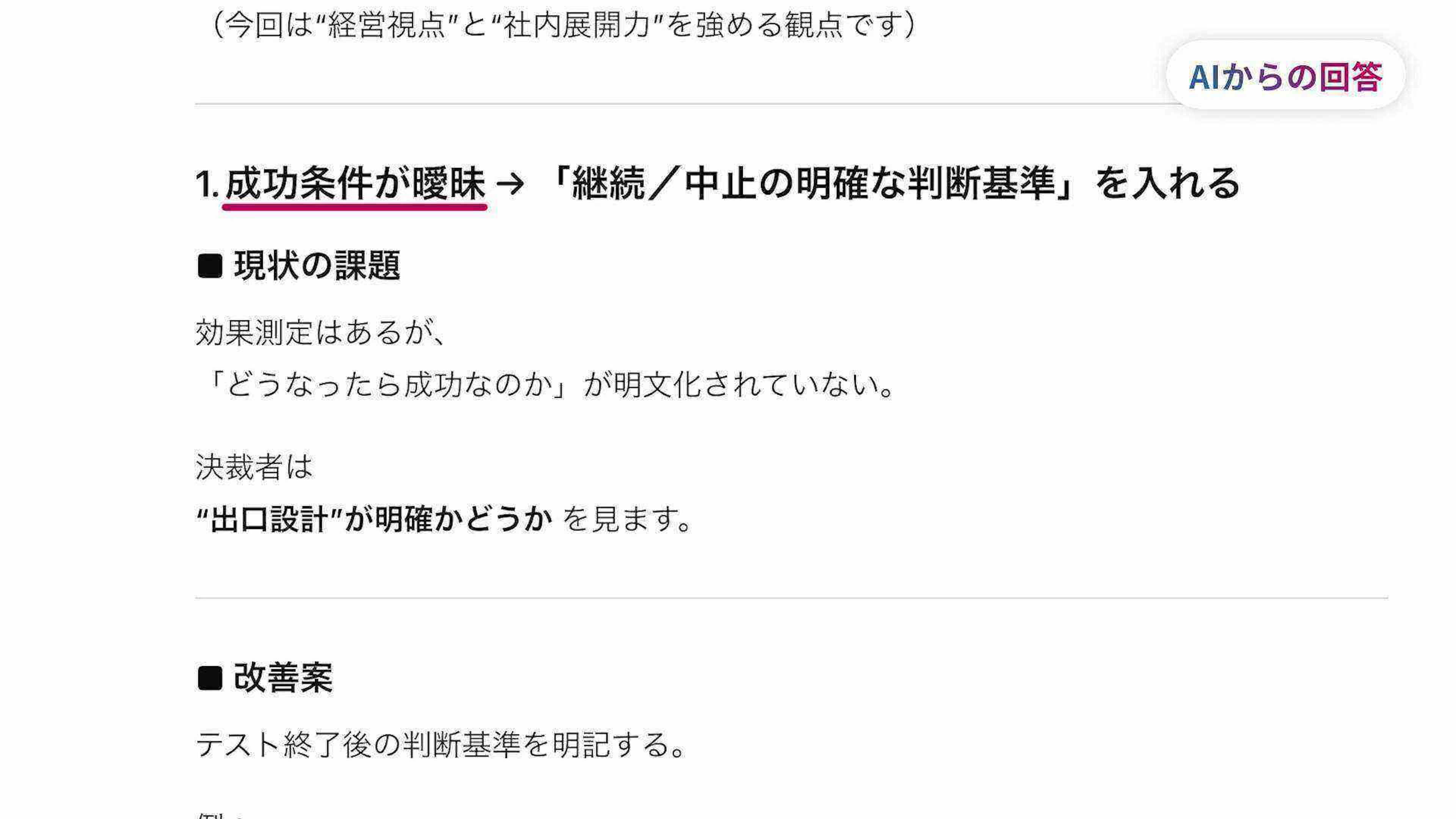 明日の仕事で、9位で紹介した「もっとよくできるところTOP3を改善案とともに提案して」のフレーズをAIに伝えて、AIからフィードバックをもらってみてください。