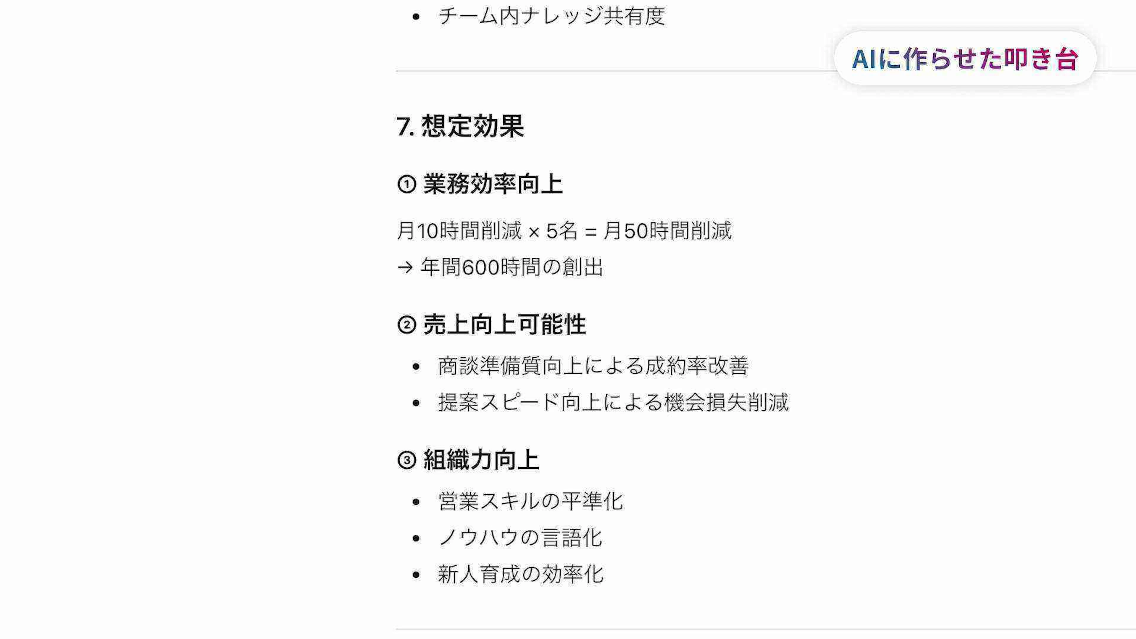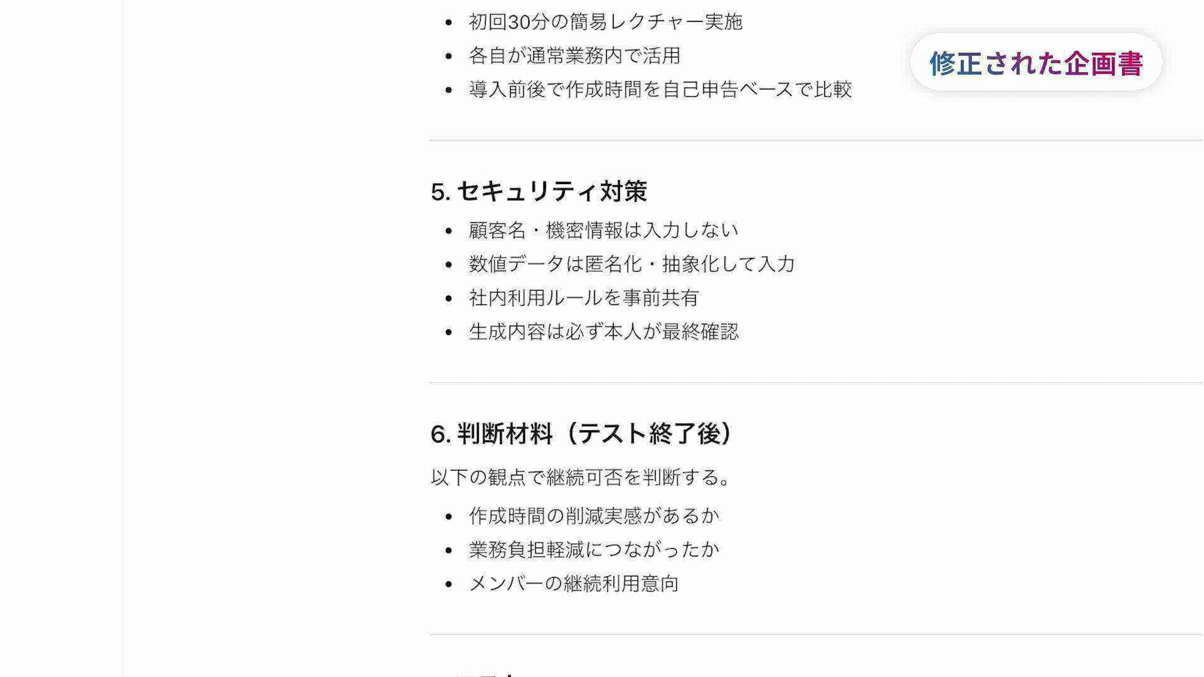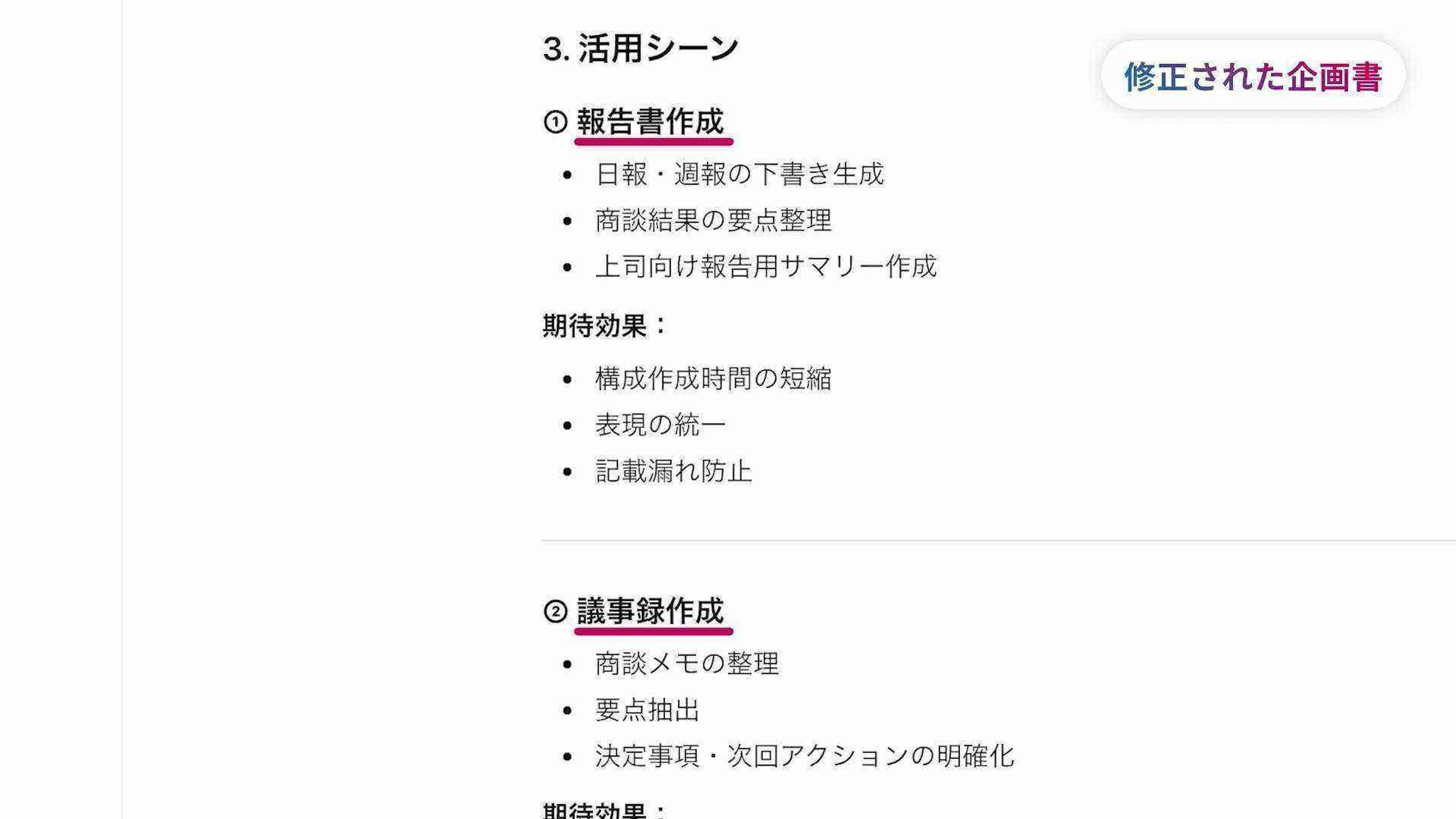 一方、AIにまず提案させたことで、自分一人では出てこなかった案が次々と出てきた。