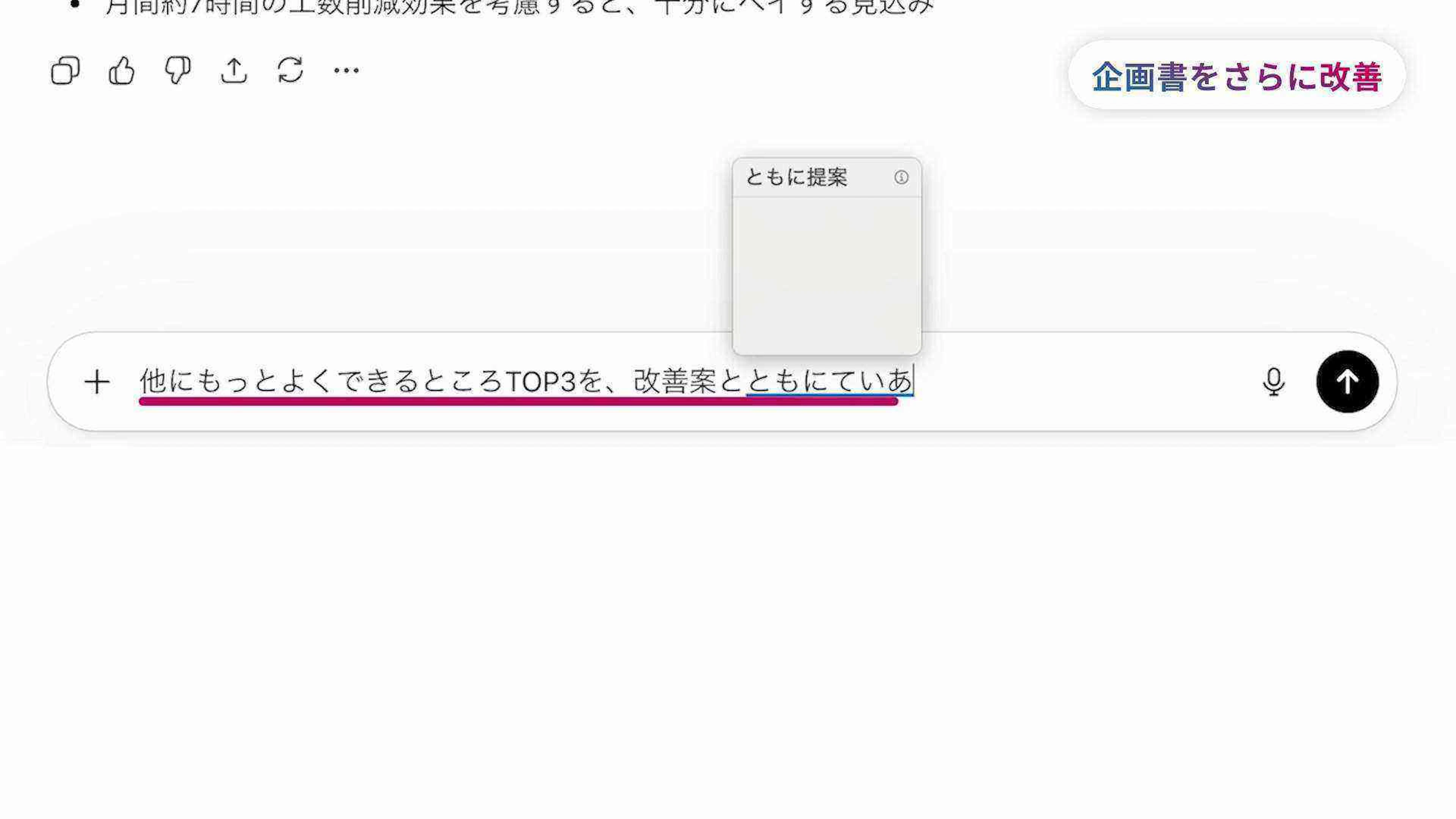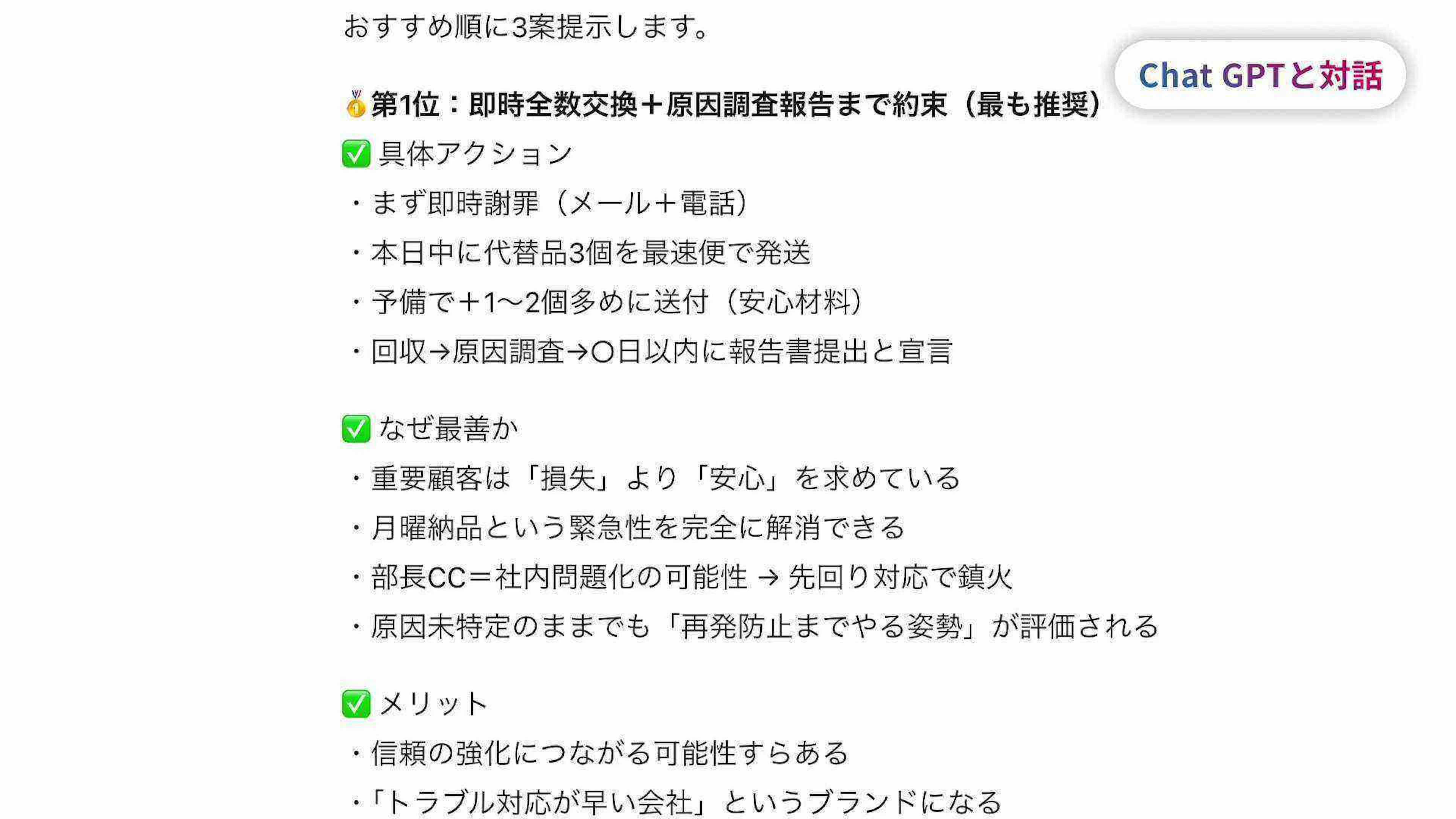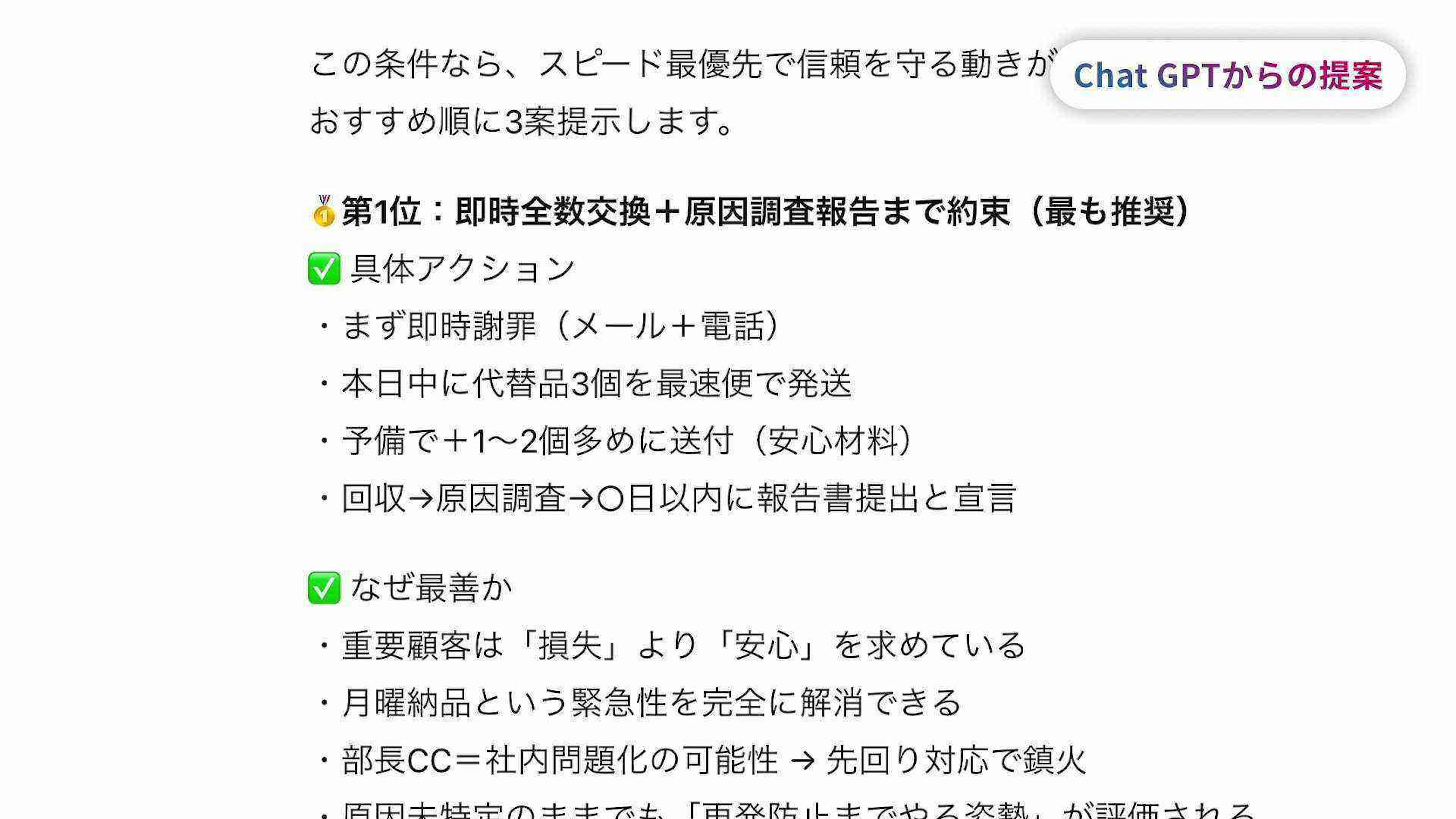 「最善の案を3つ、おすすめ順に理由付きで提案して」は「ていあん」で。