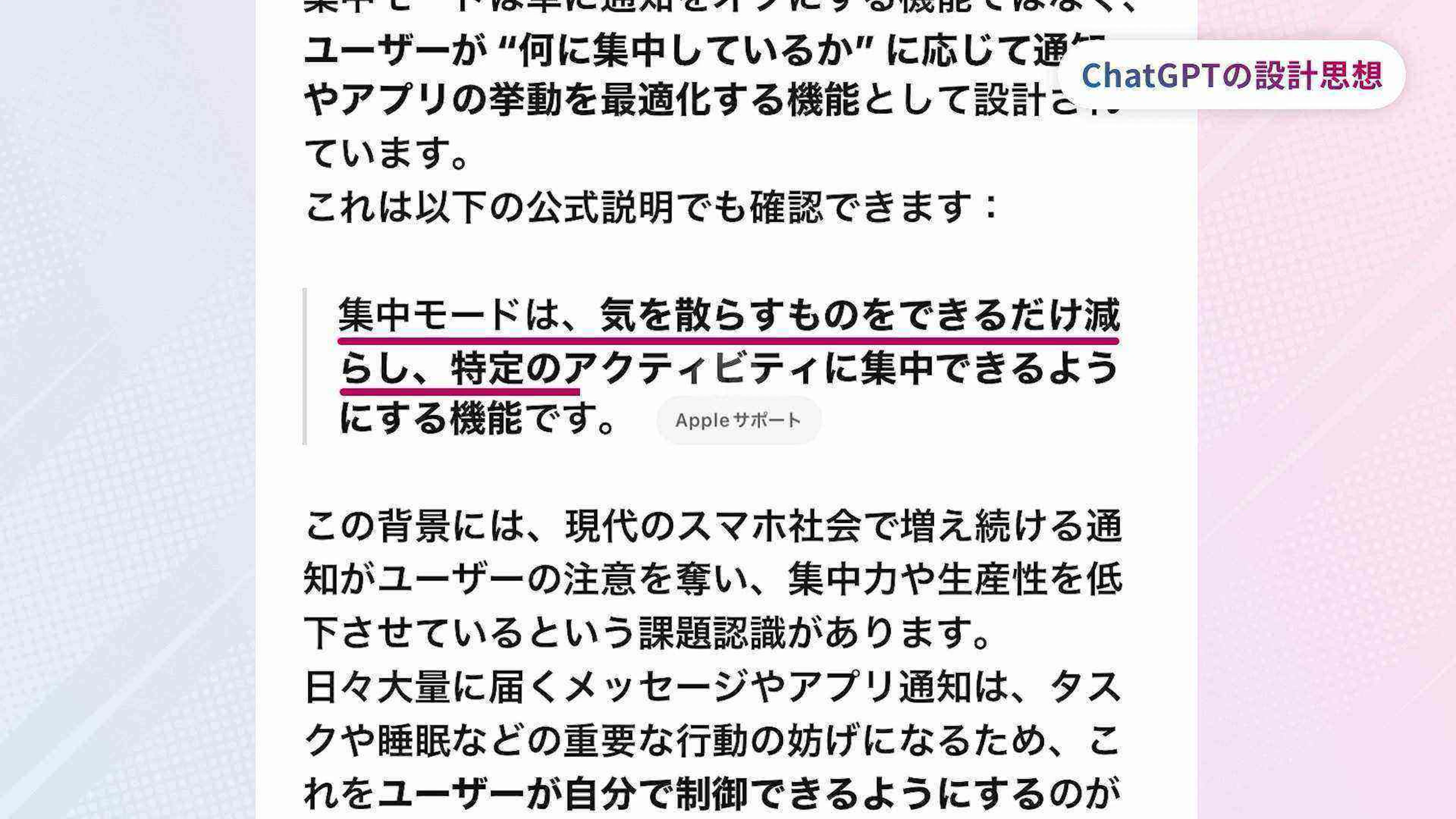 なぜAppleがこの機能を集中モードとして作ったのか、AIに聞いてみます。