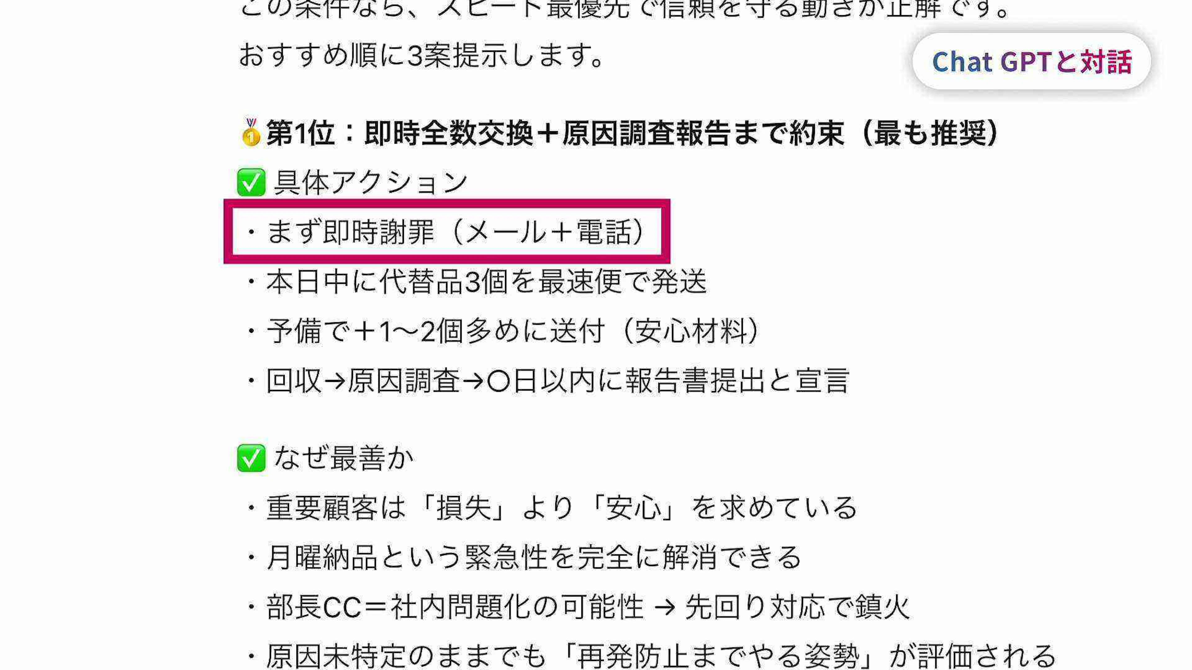 もちろん電話や予備の送付は上長への確認が必要だと思いますが、こうした案がまず出てくることが重要です。
