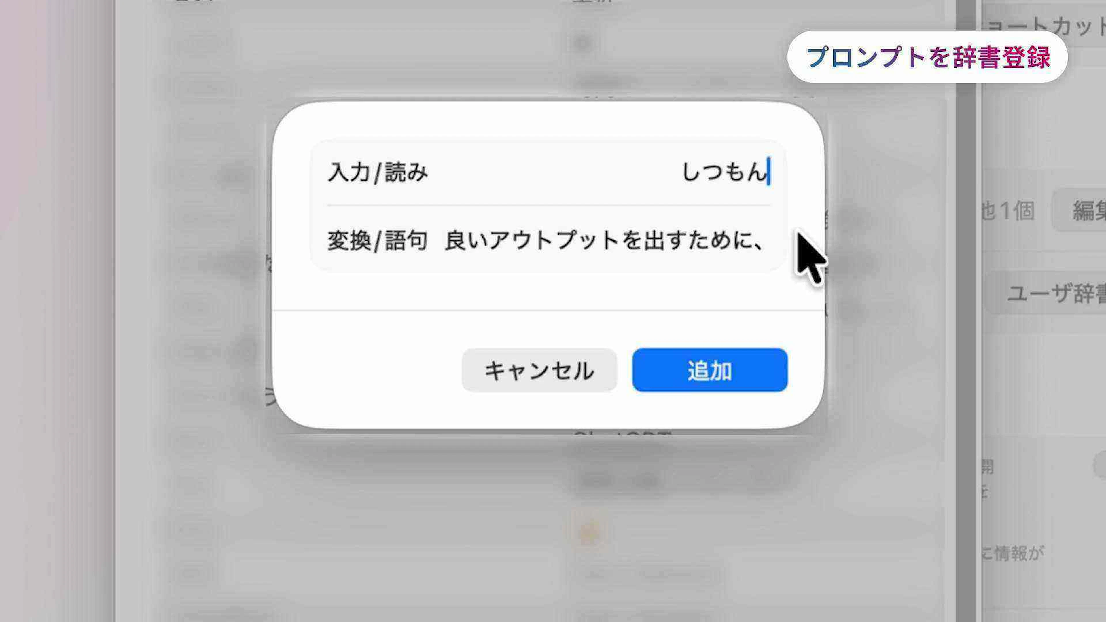 「良いアウトプットを出すために、私に聞きたいことを3つに絞って質問してください。質問は1つずつ行って進めてください」は「しつもん」で登録しています。