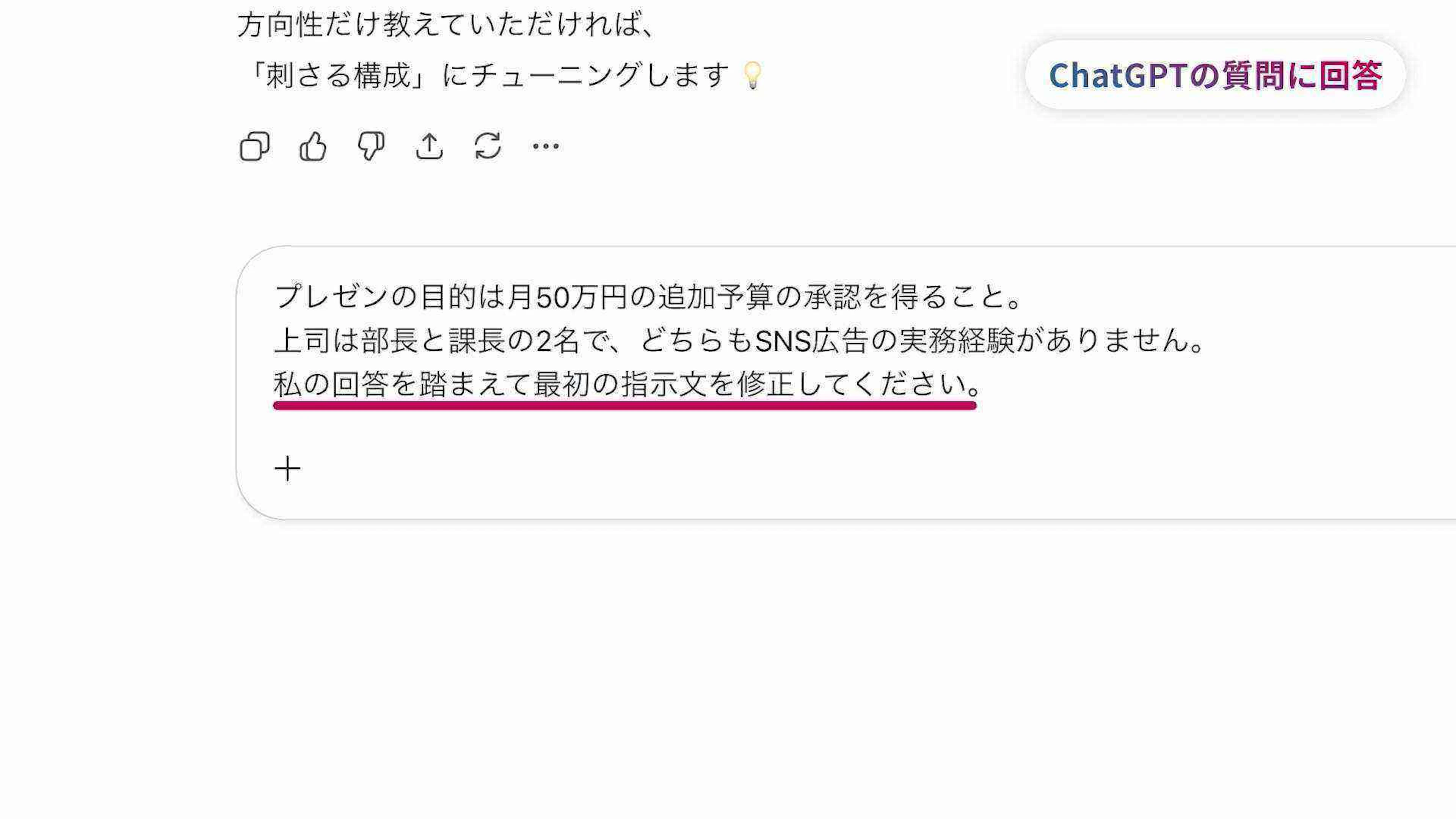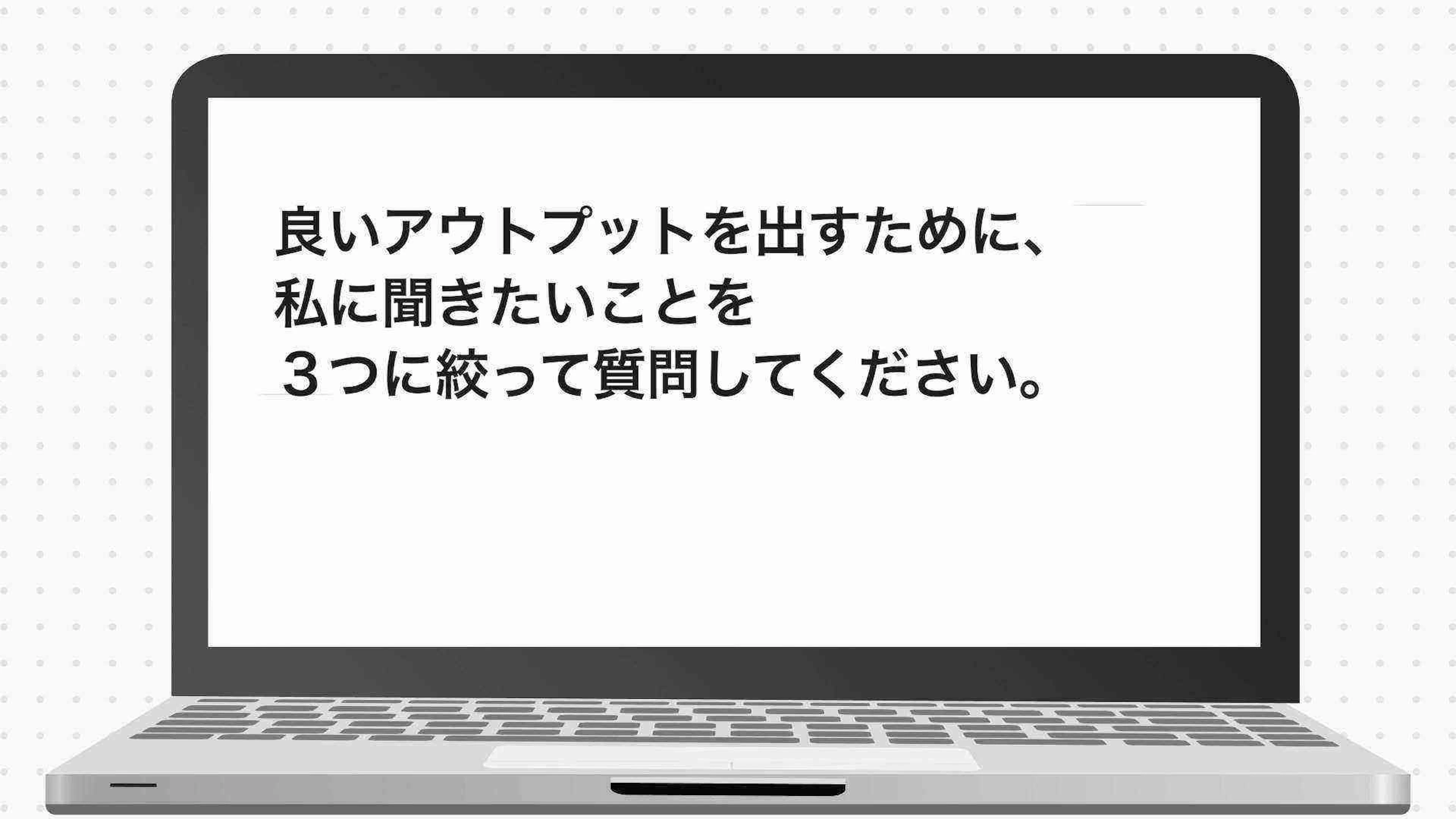 2つ目が「良いアウトプットを出すために、私に聞きたいことを3つに絞って質問してください。質問は1つずつ行って進めてください」。