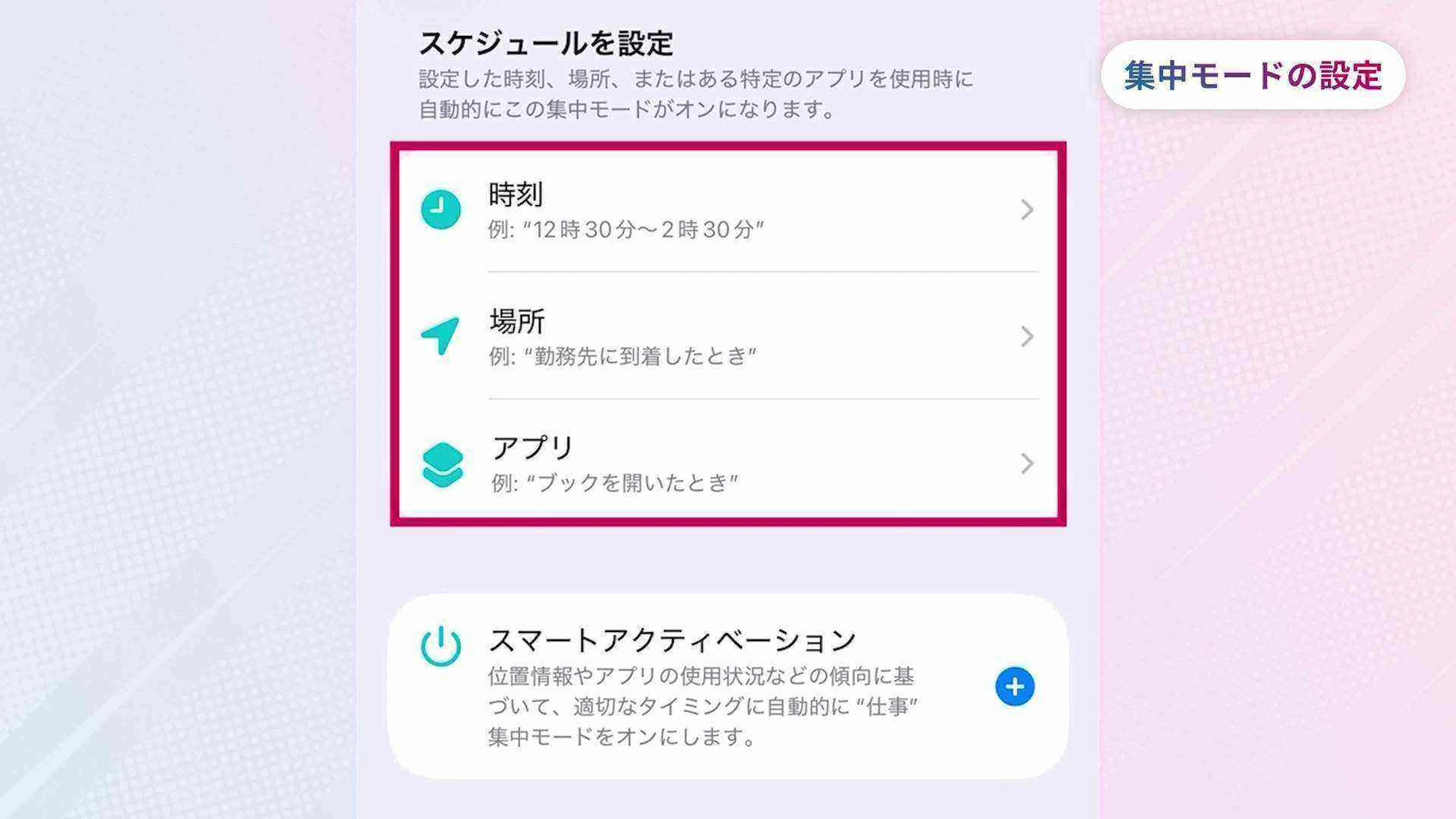 ここで時間・場所・アプリの起動をトリガーに、自動で切り替わるように設定できます。
