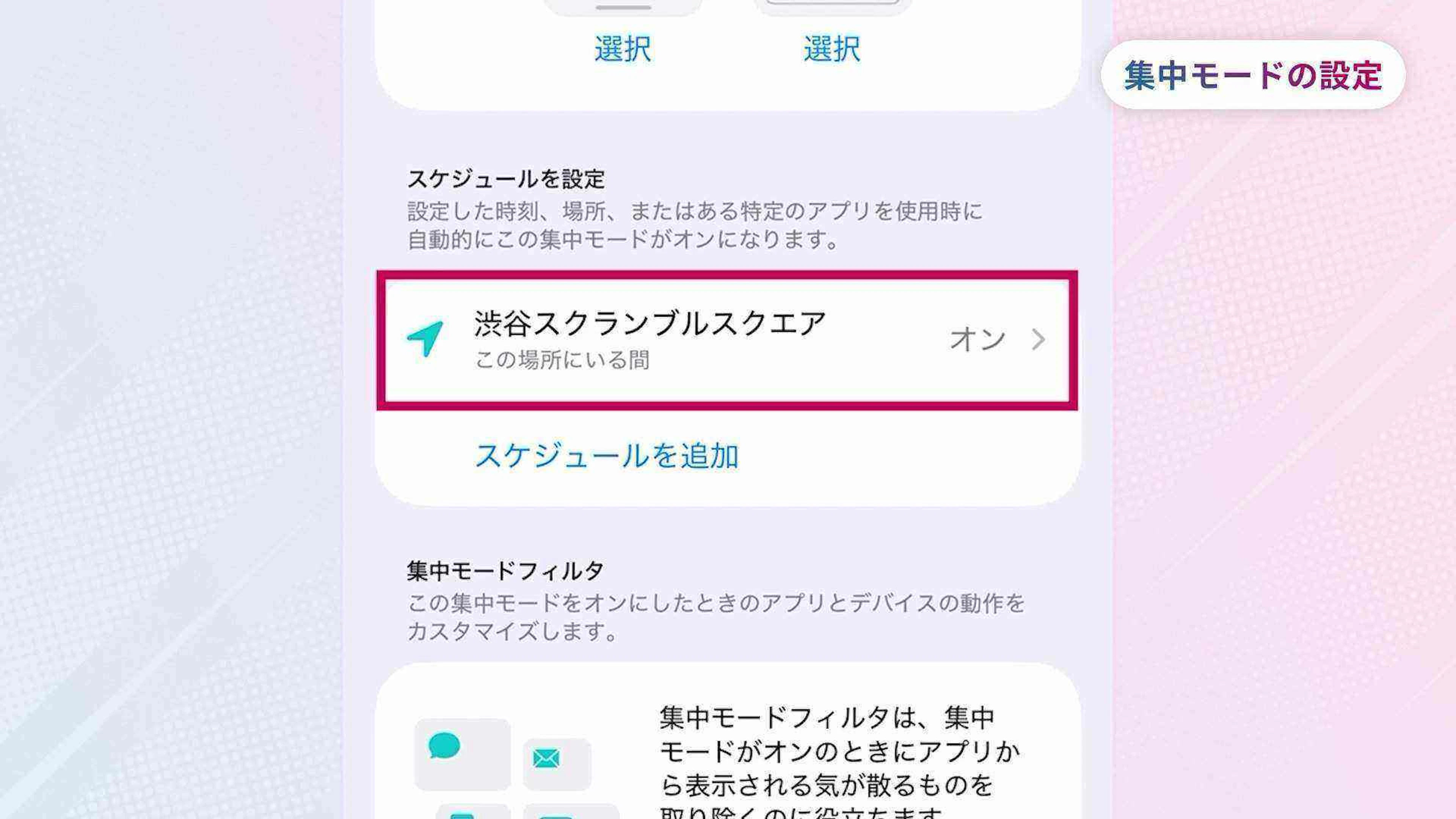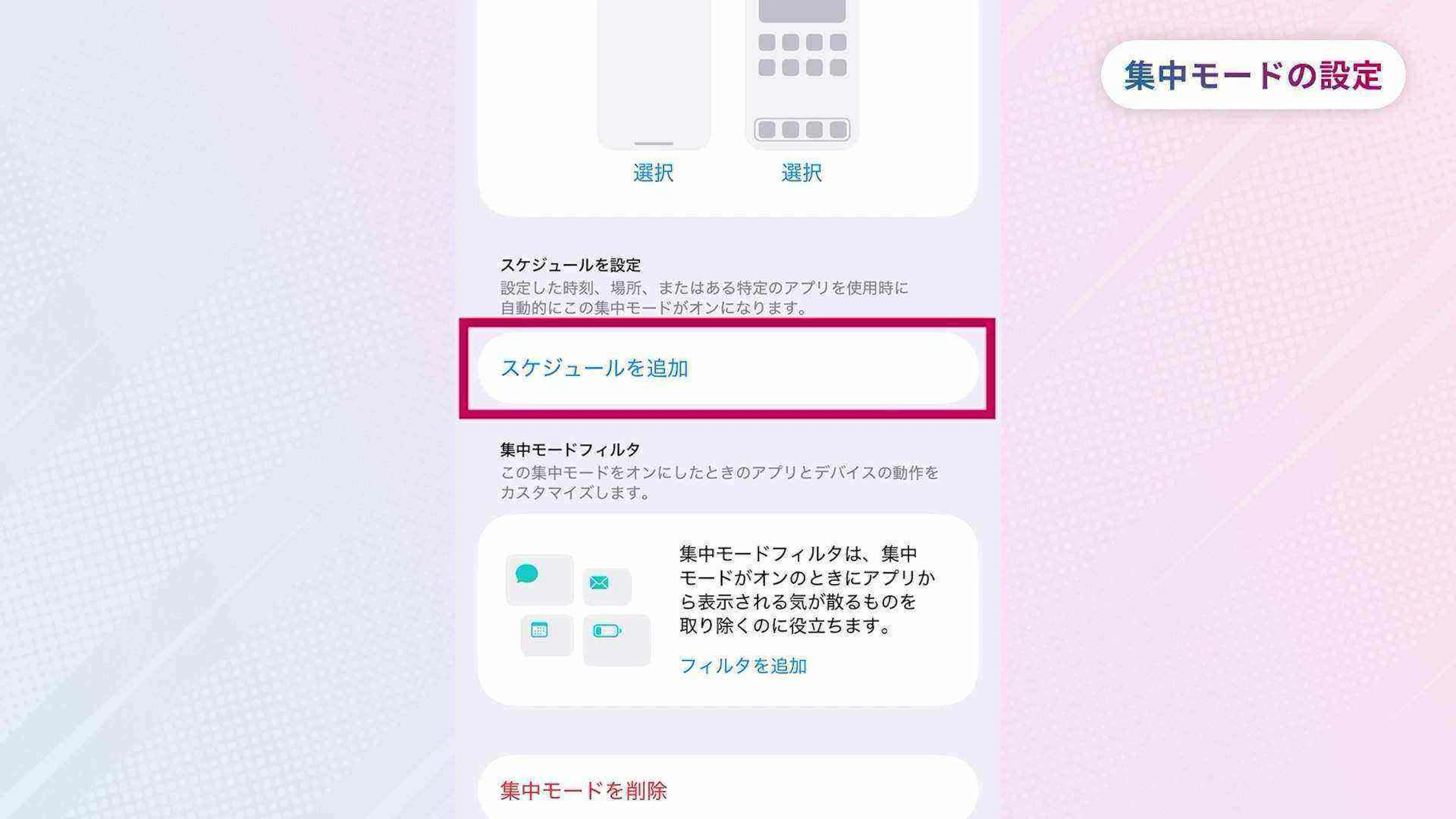 集中モードの設定画面を開いて、下の方にある「スケジュールを追加」を押してみてください。