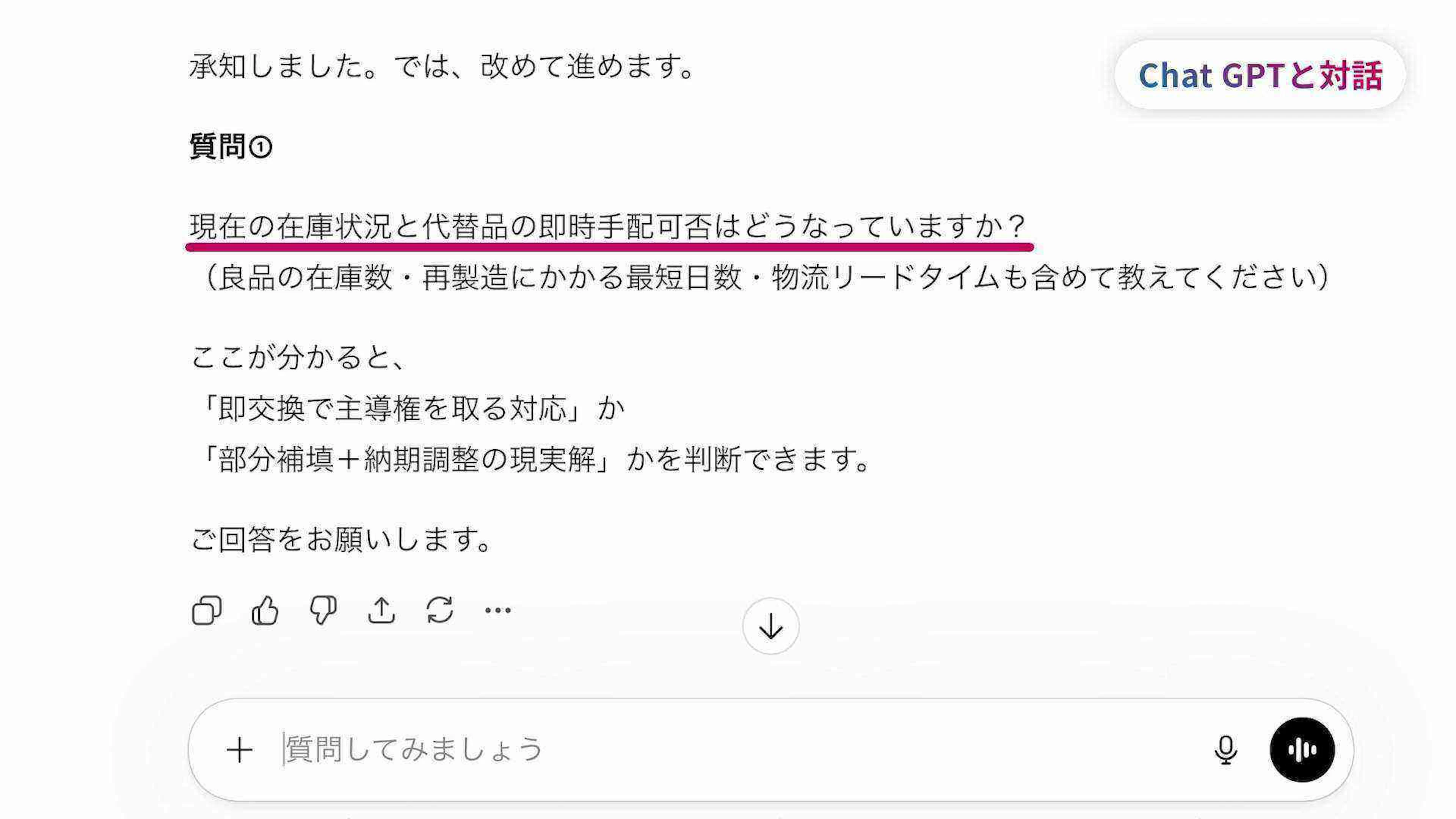 「現在の在庫状況と代替品の即時手配可否」か...なるほど、まず在庫の状況を聞いてくるんですね。