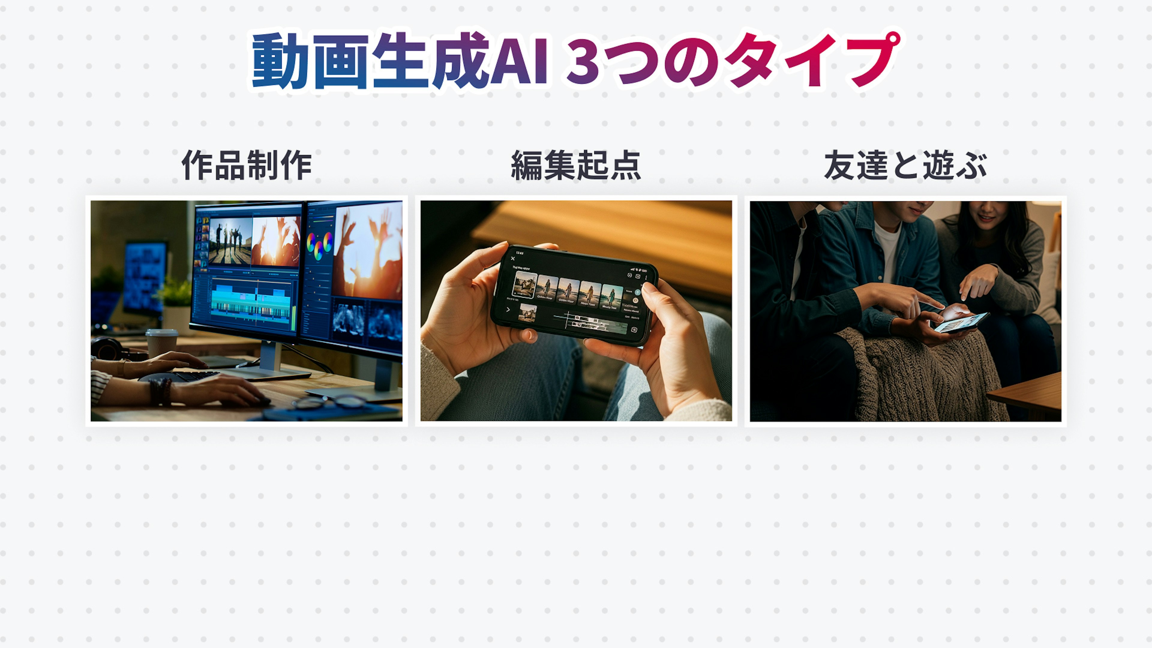その理由を理解するために、AI動画生成の世界を3つの「種類」に分けて見ていきましょう。