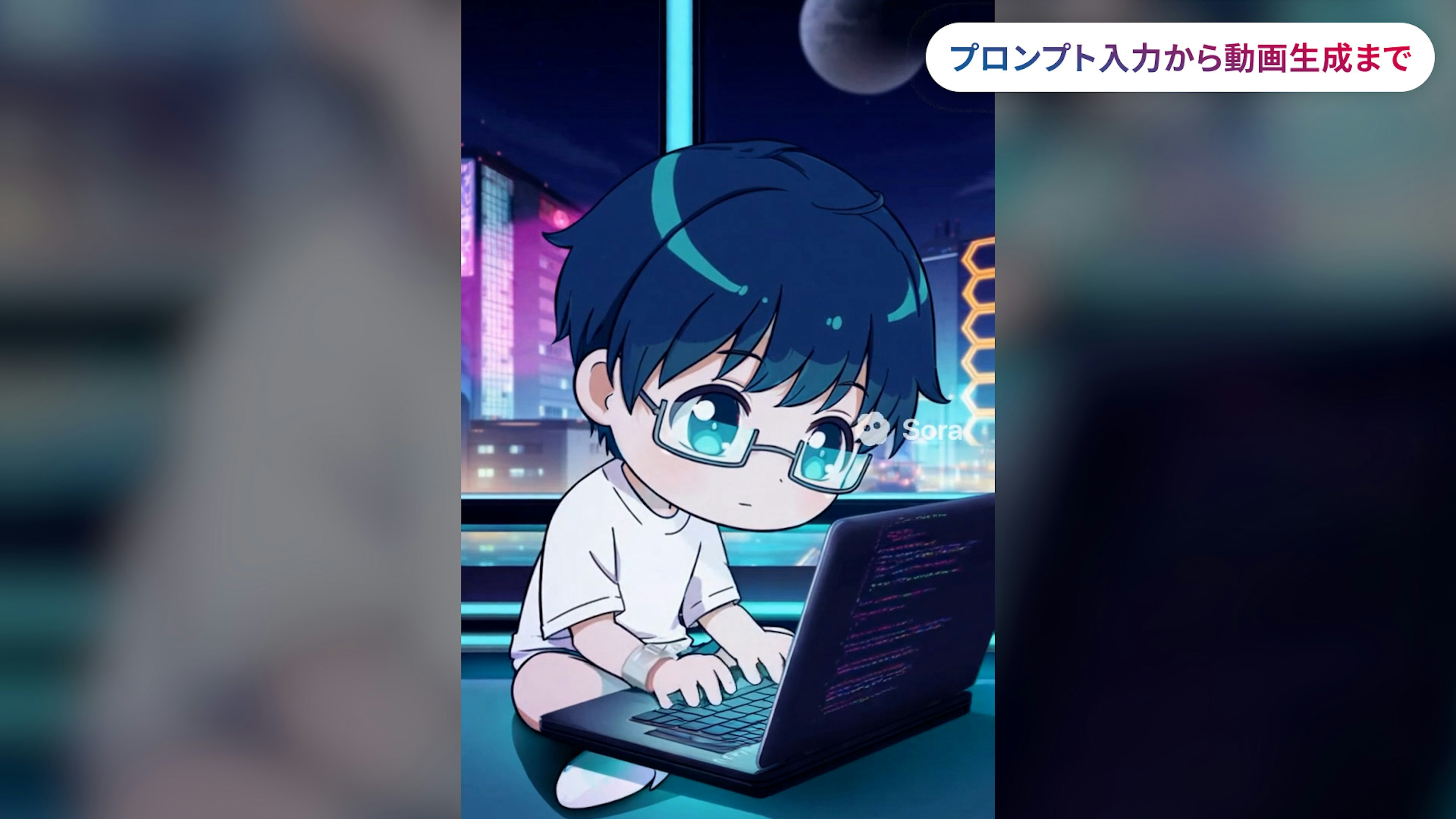 かっこいい男の子が未来都市で光るラップトップを前にコーディングしている、でお願いします!